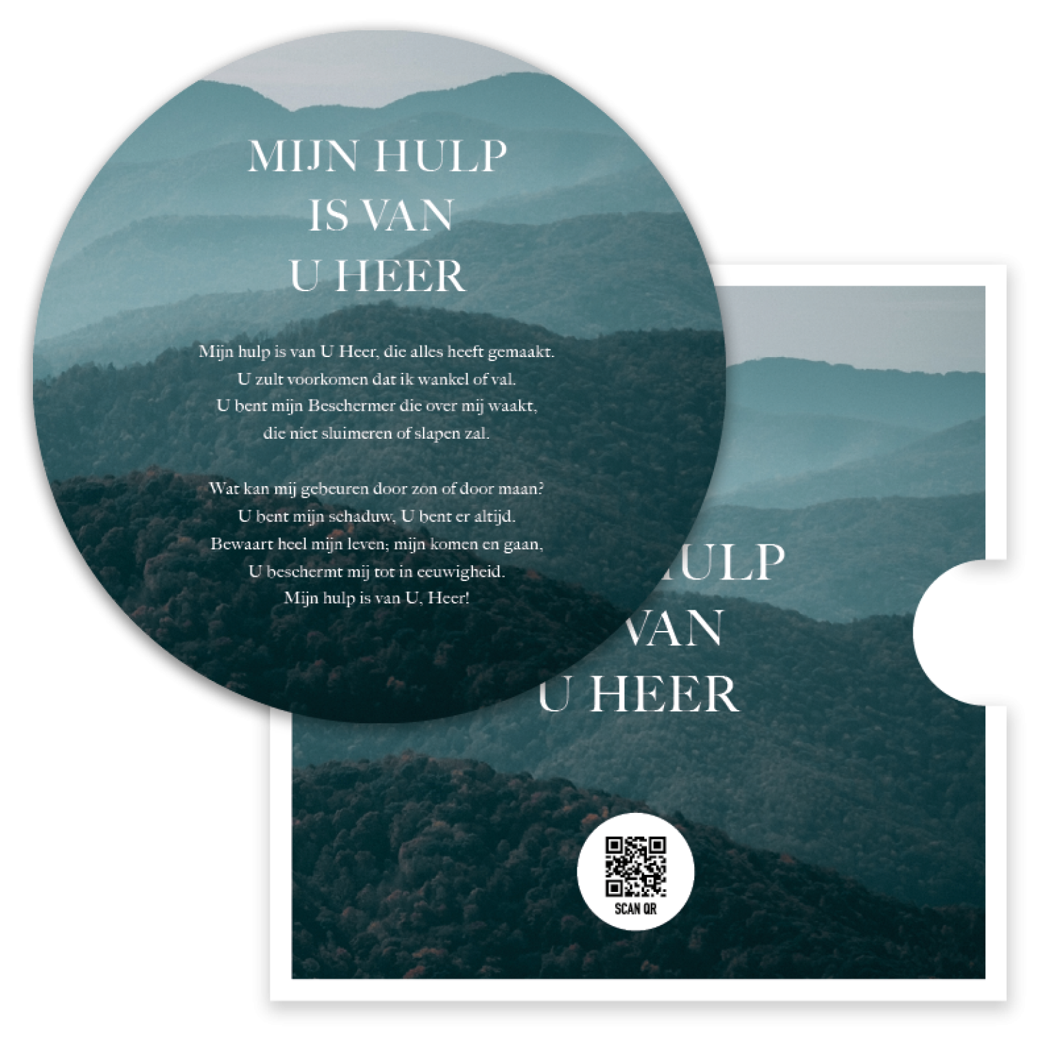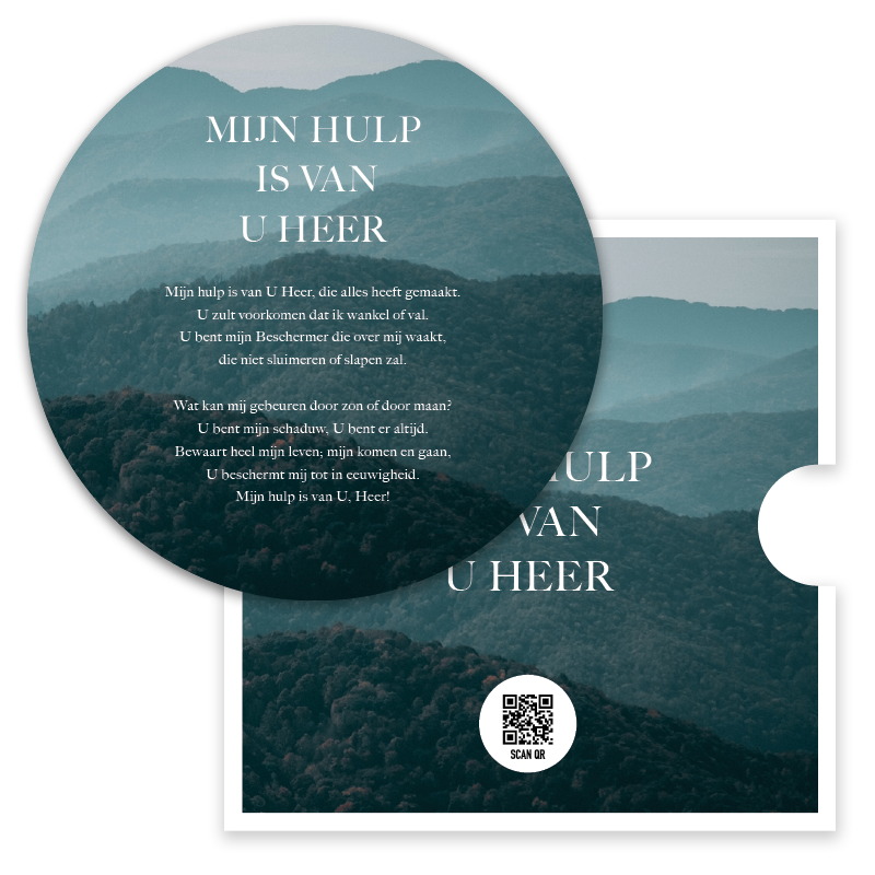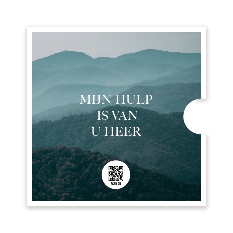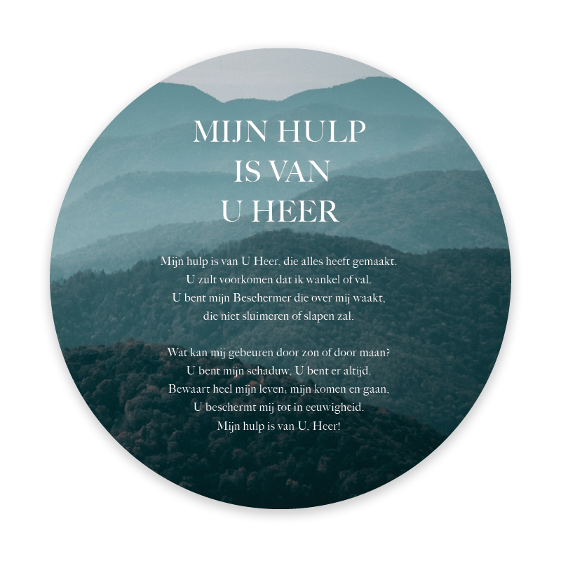 Prachtige ronde fotokaart met de tekst ‘Mijn hulp is van U Heer’ op een sfeervolle achtergrond van bergen. Een kaart vol bemoediging en vertrouwen, perfect om te versturen of neer te zetten als inspirerende herinnering aan Gods trouw.