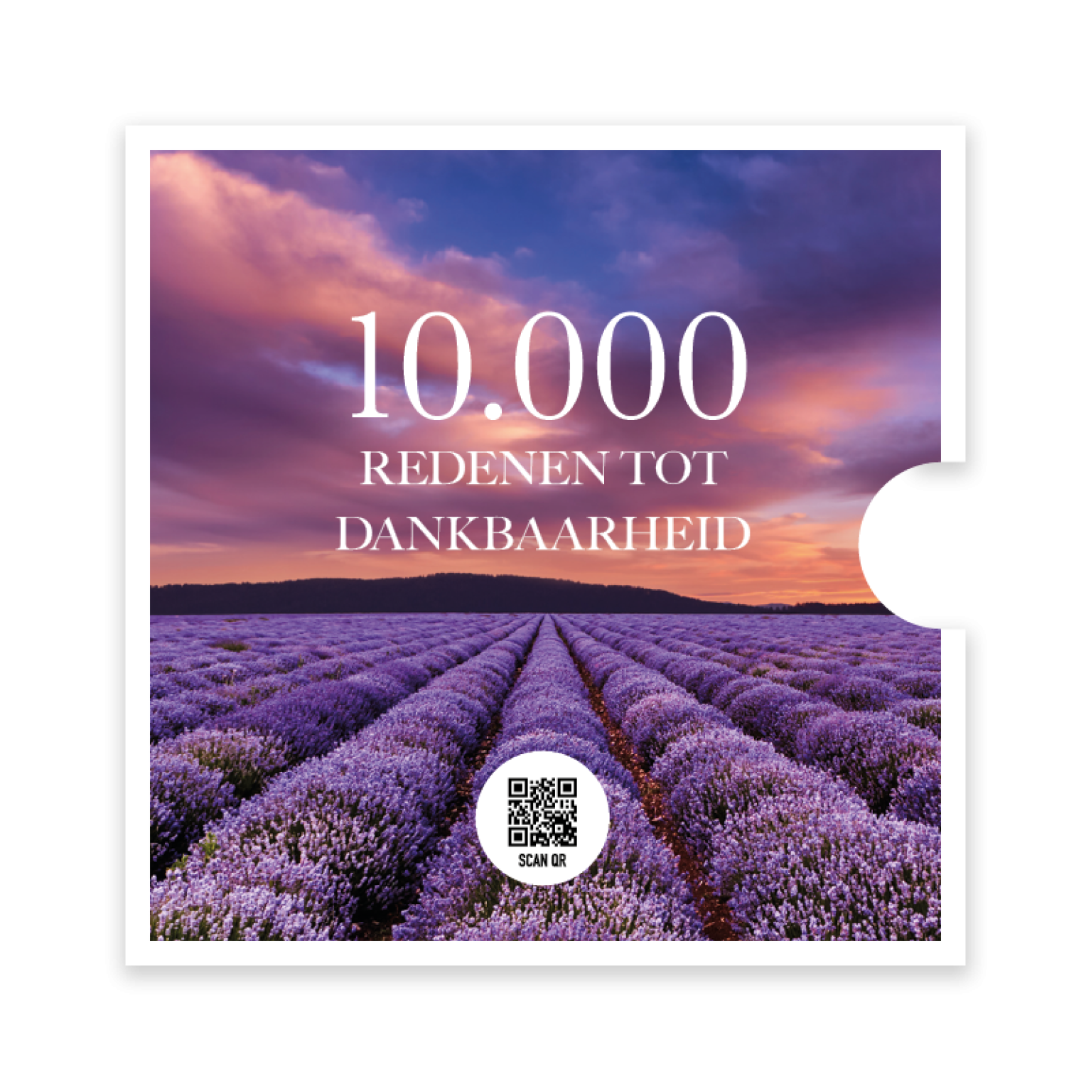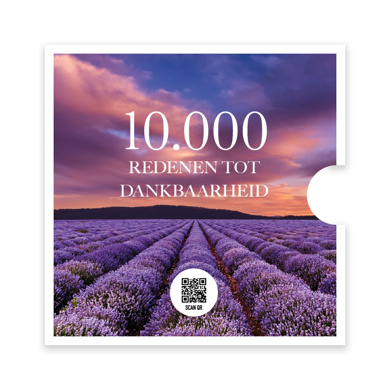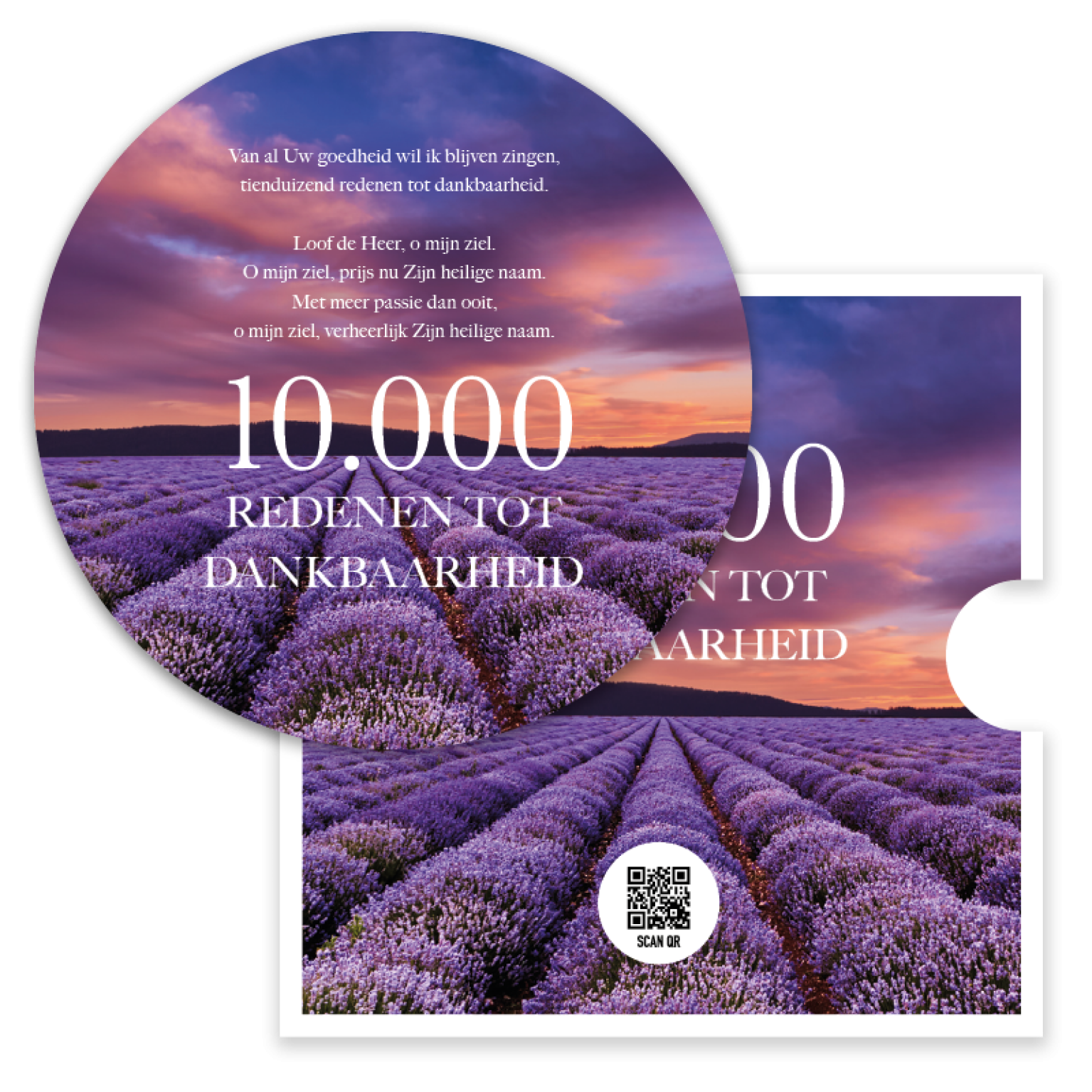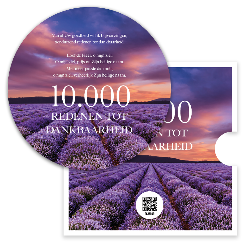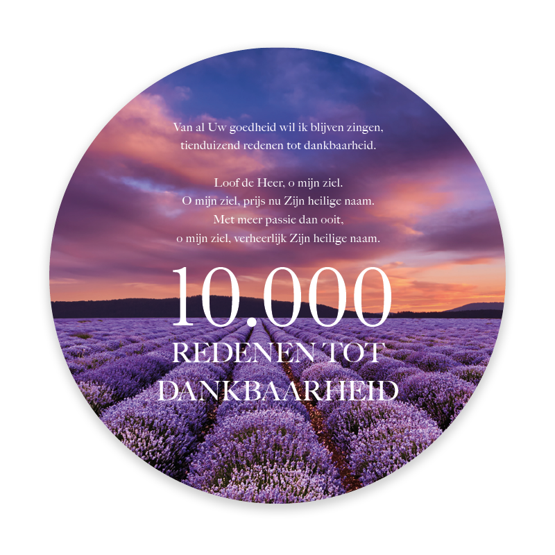Prachtige ronde fotokaart met de tekst ‘10.000 redenen tot dankbaarheid’ en een serene achtergrond van een lavendelveld. De kaart bevat een handige QR-code die direct leidt naar het muziekbestand van Opwekking 733. Een extra mooie toevoeging voor een moment van bezinning of lofprijzing.