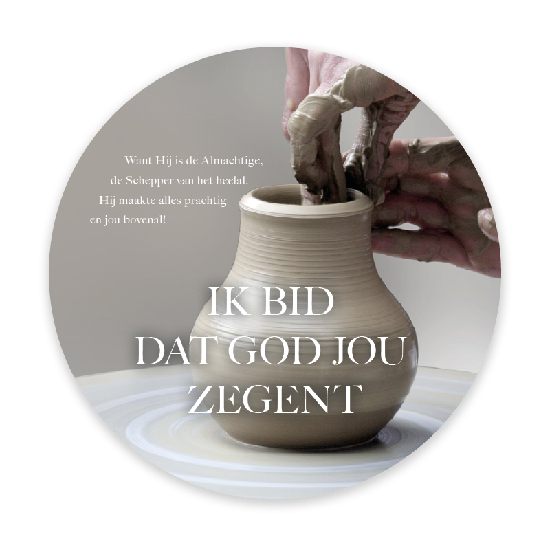 Prachtige ronde fotokaart met de tekst ‘Ik bid dat God jou zegent’ en een afbeelding van handen die een pot vormen.