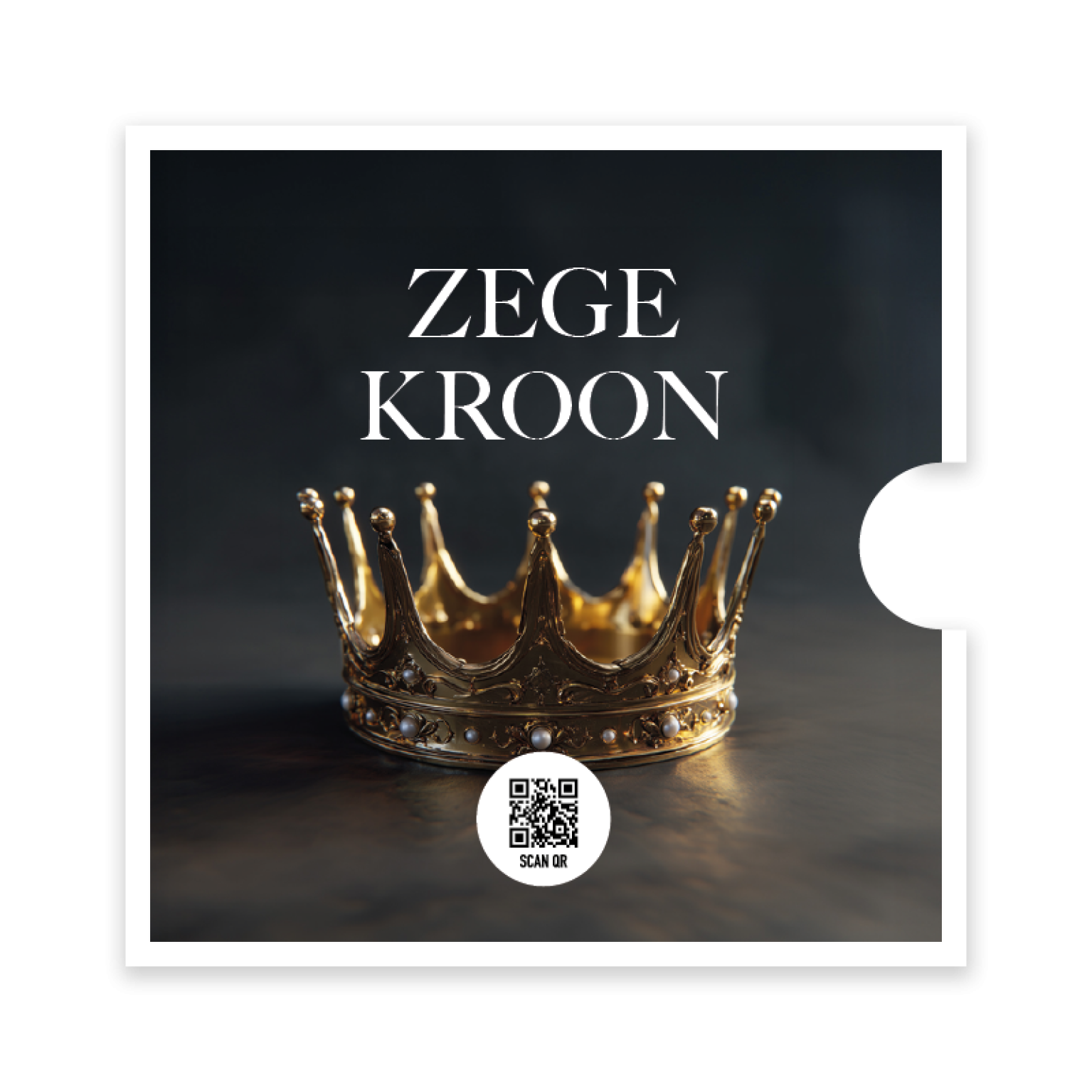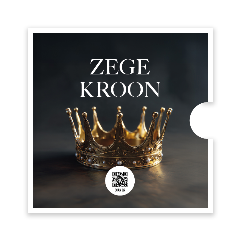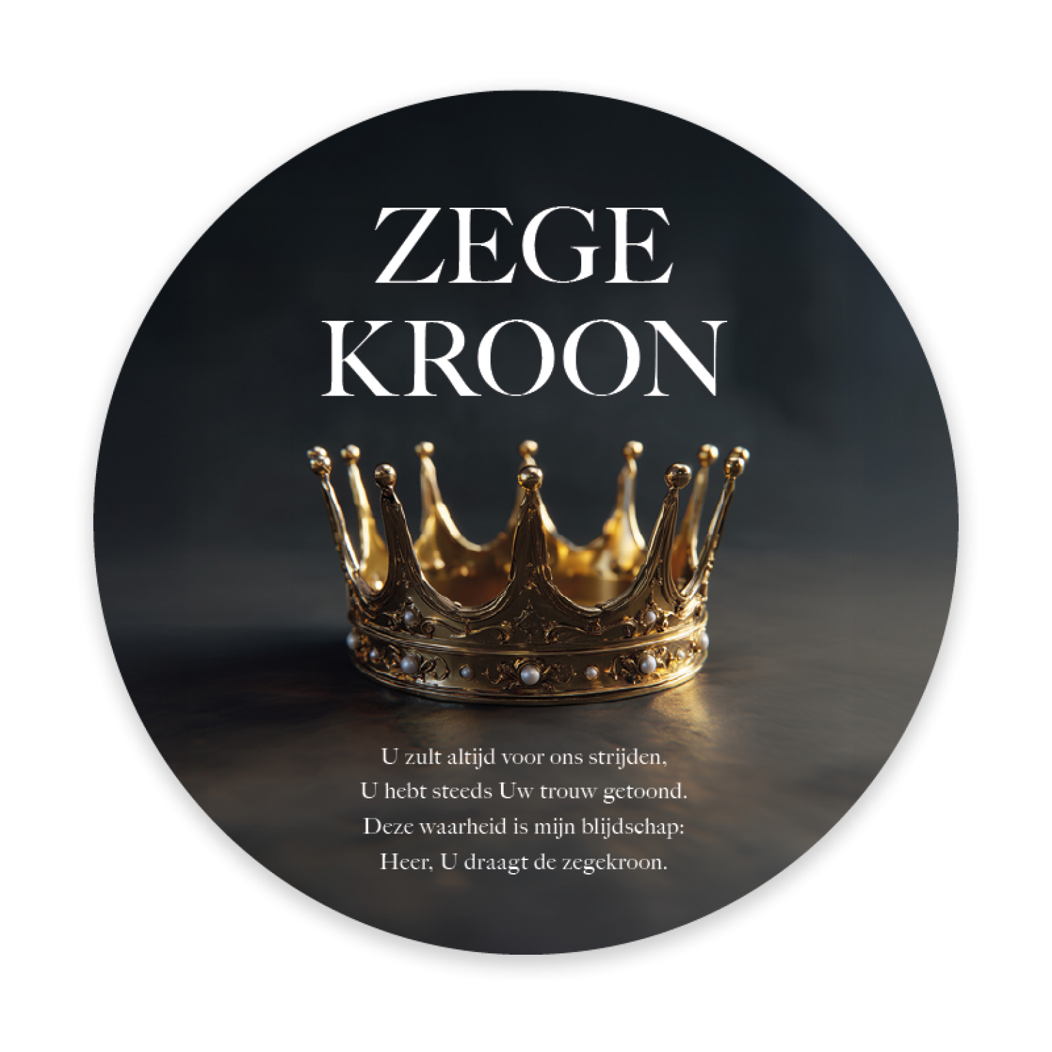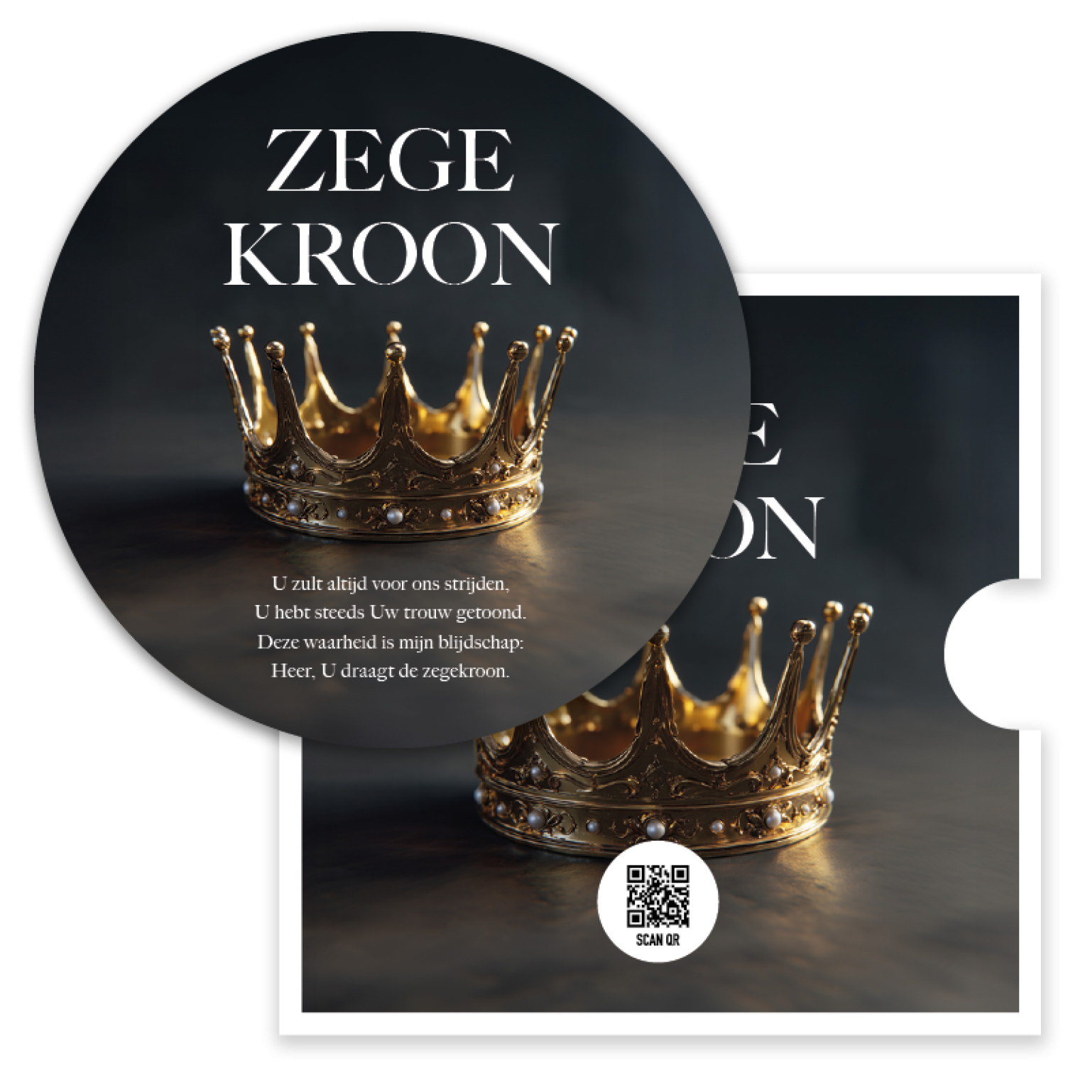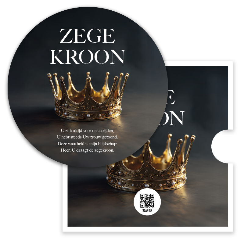 Deze ronde kaart bevat de tekst uit Opwekking 764: Zegekroon en is vormgegeven met een prachtige, koninklijke kroon. De kaart zit in een cd-hoesje met dezelfde afbeelding en een QR-code die verwijst naar het bijbehorende lied. Een kaart om Gods victorie en overwinning te delen en te vieren.