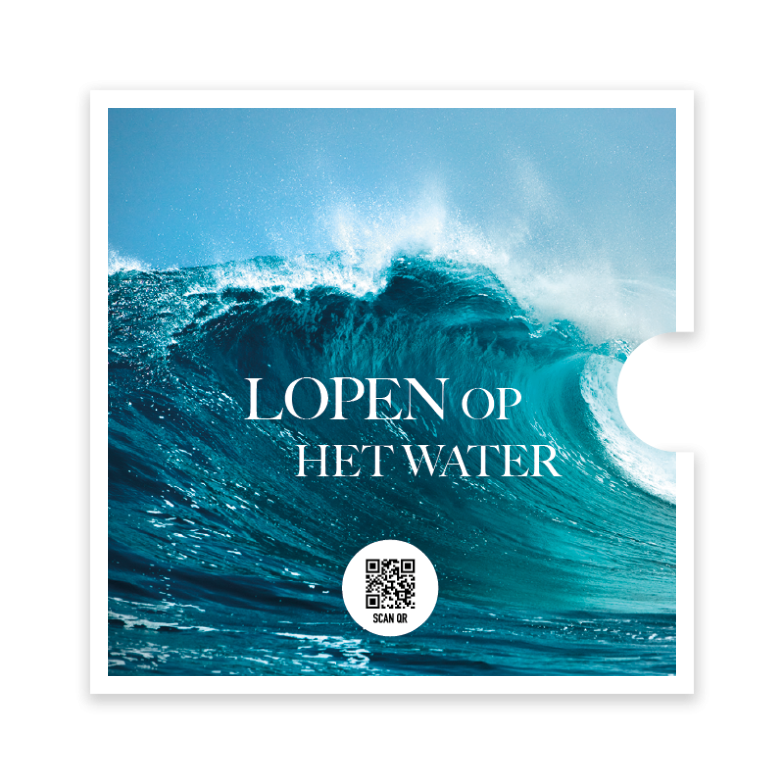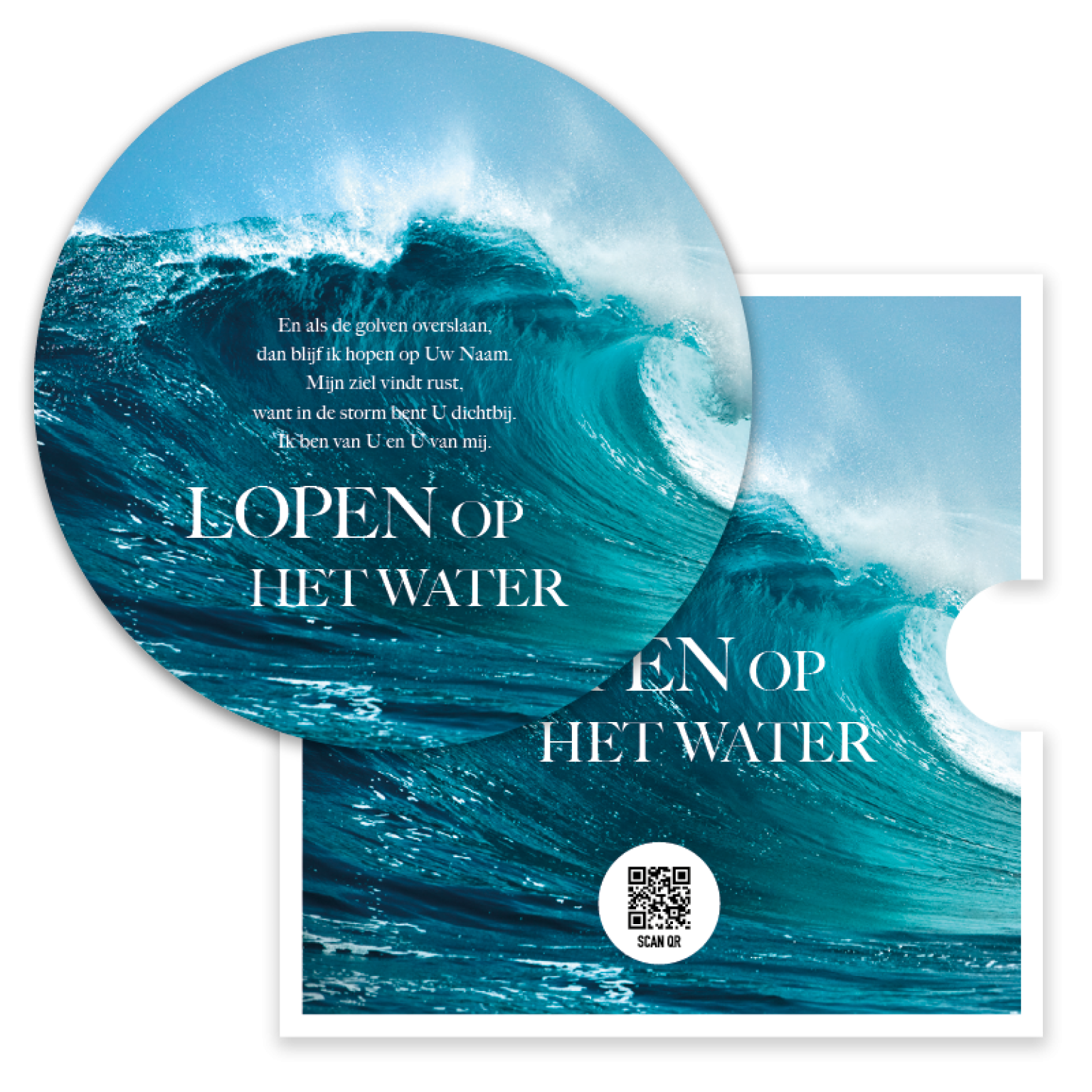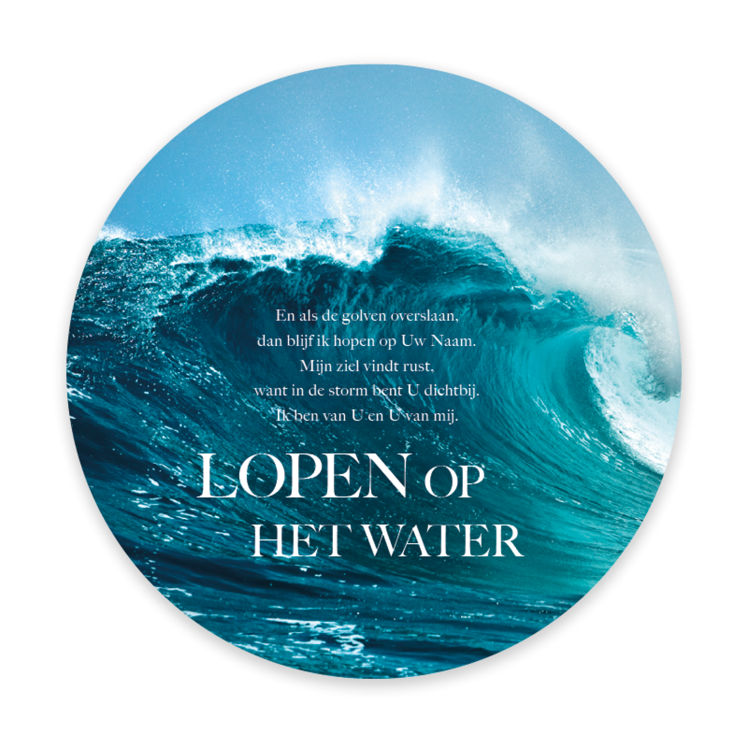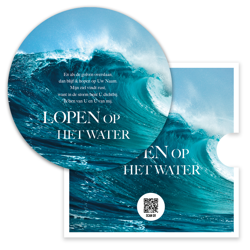 Prachtige ronde fotokaart met de tekst ‘Lopen op het water’ en een achtergrond van een golvende zee. Deze bemoedigende kaart herinnert eraan dat God ook in de storm dichtbij is. De kaart bevat een handige QR-code die direct leidt naar het muziekbestand van Opwekking 789, voor een extra laag van geloof en inspiratie.