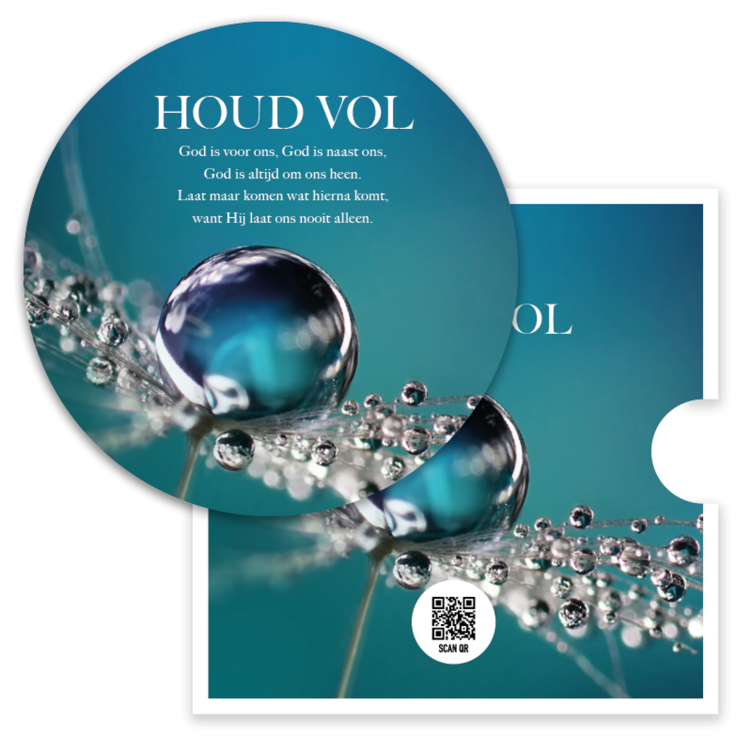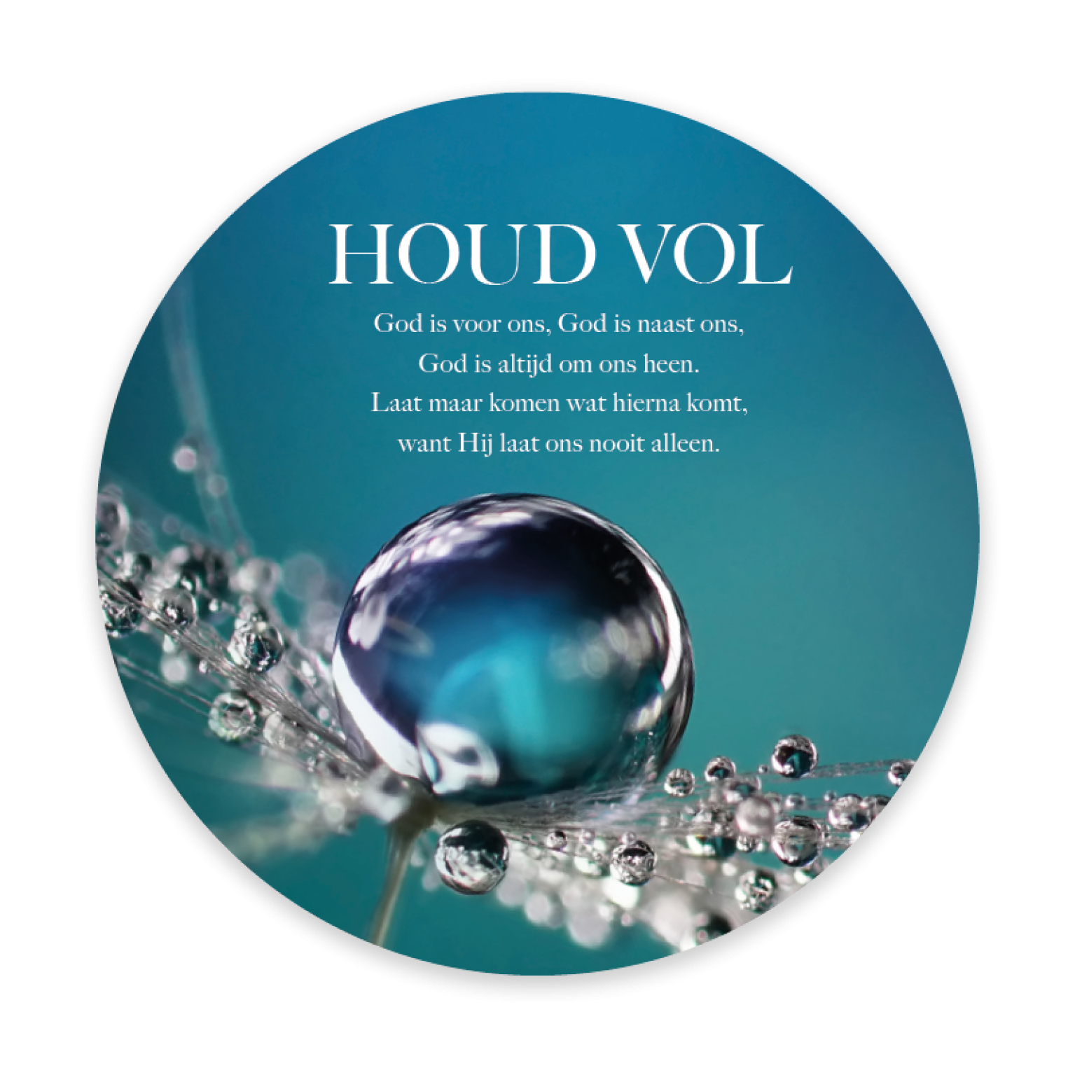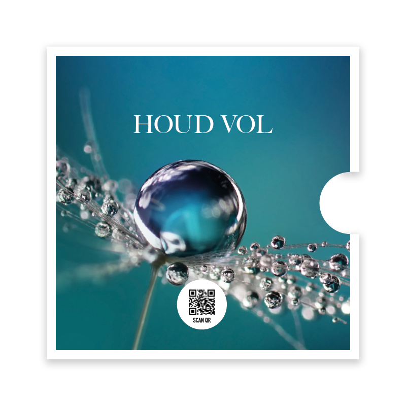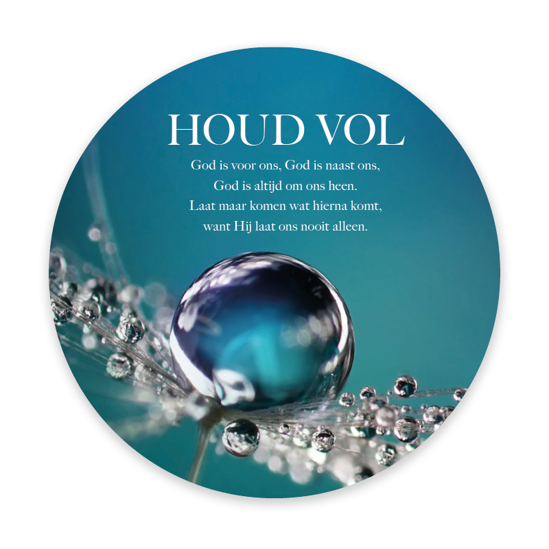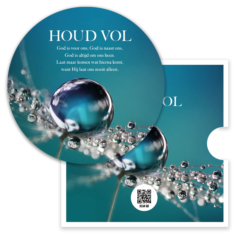 Prachtige ronde fotokaart met de tekst ‘Houd vol’ en een sfeervolle afbeelding van een bloem met een waterdruppel. Deze bemoedigende kaart bevat een QR-code die direct leidt naar het muziekbestand van Opwekking 798; een inspirerende manier om geloof en hoop te delen.