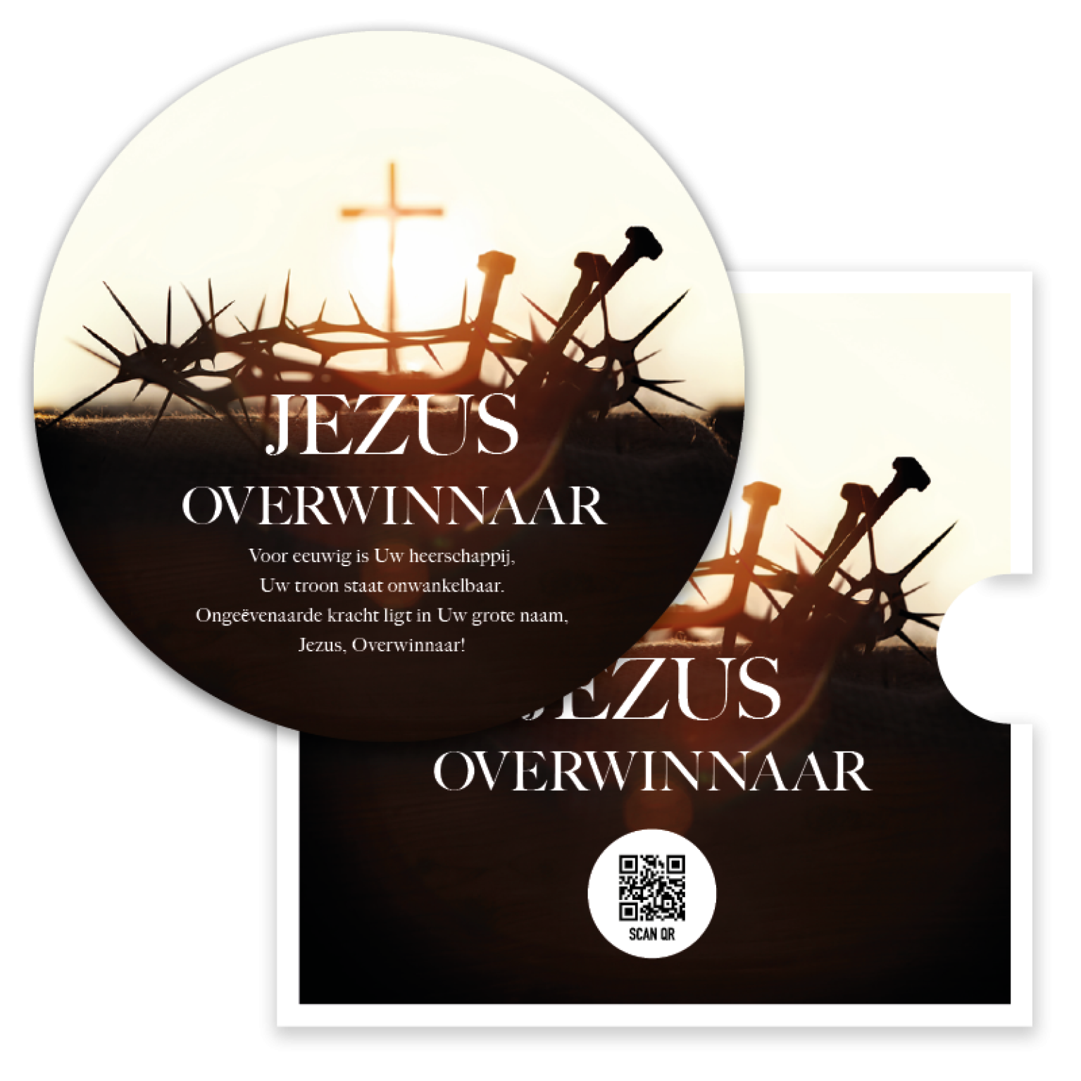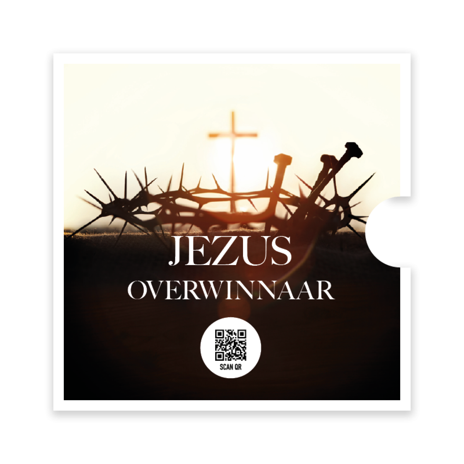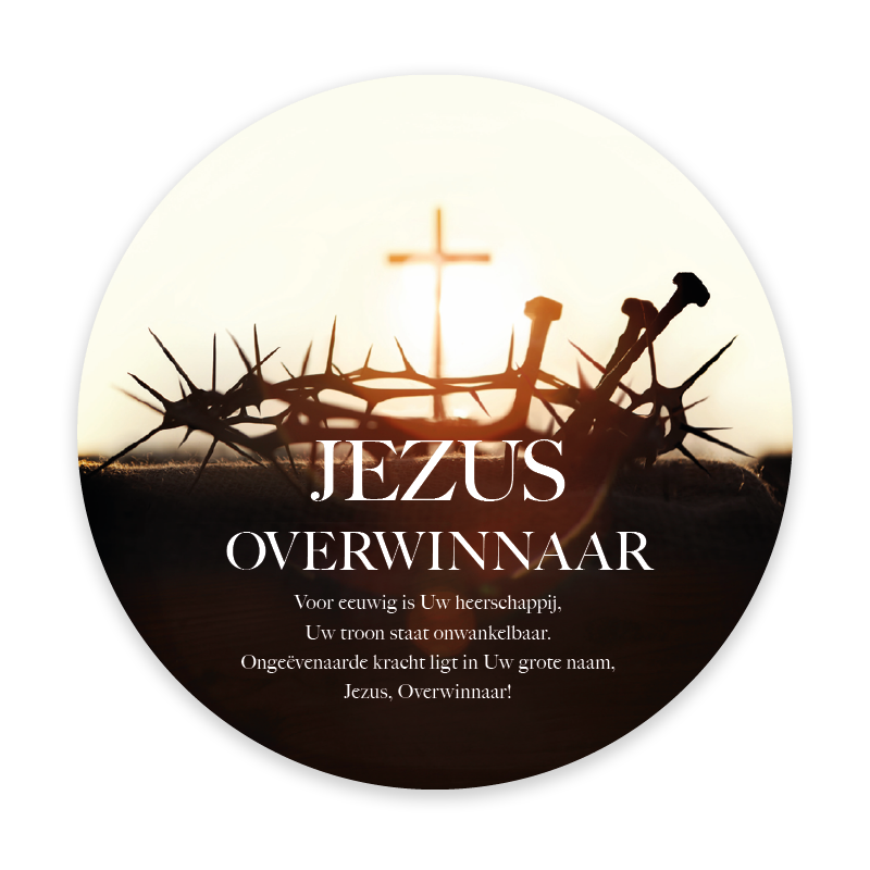 Prachtige ronde fotokaart met de tekst ‘Jezus Overwinnaar’. De kaart toont een indrukwekkend ontwerp van een doornenkroon met daarachter een kruis, symbool van overwinning en genade. Een bijzondere kaart ter bemoediging, voorzien van een QR-code die direct leidt naar het lied Opwekking 832 ‘Jezus Overwinnaar’.