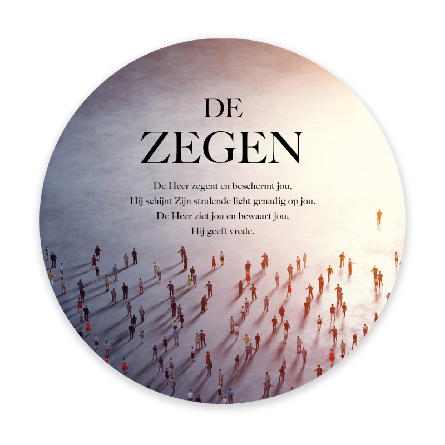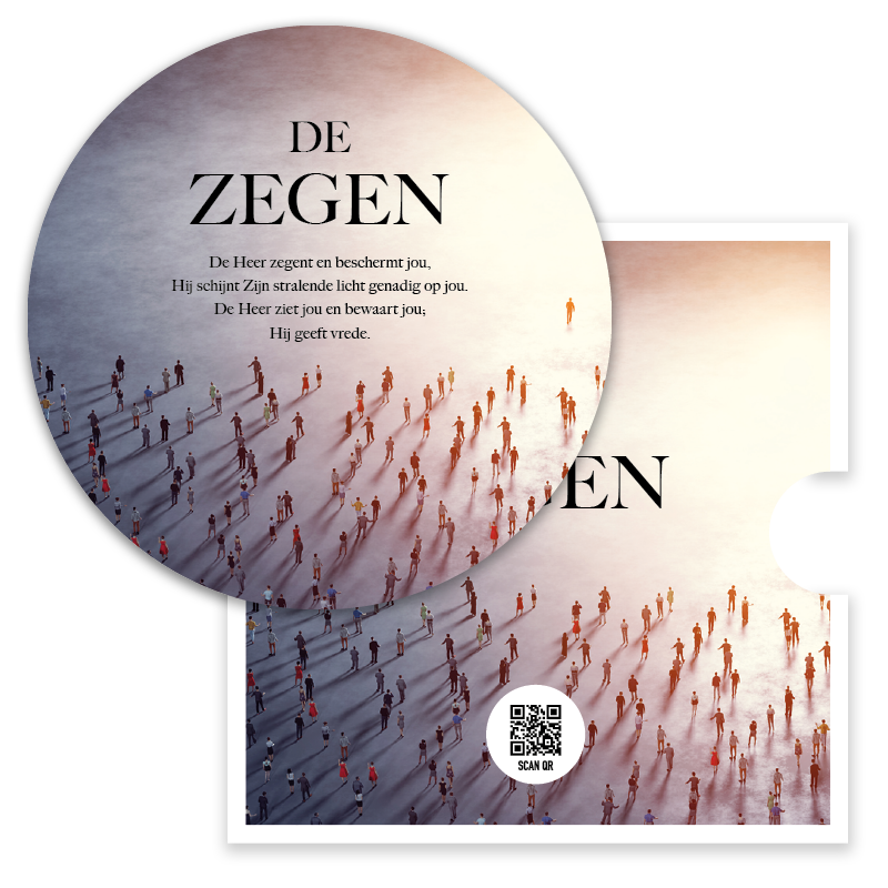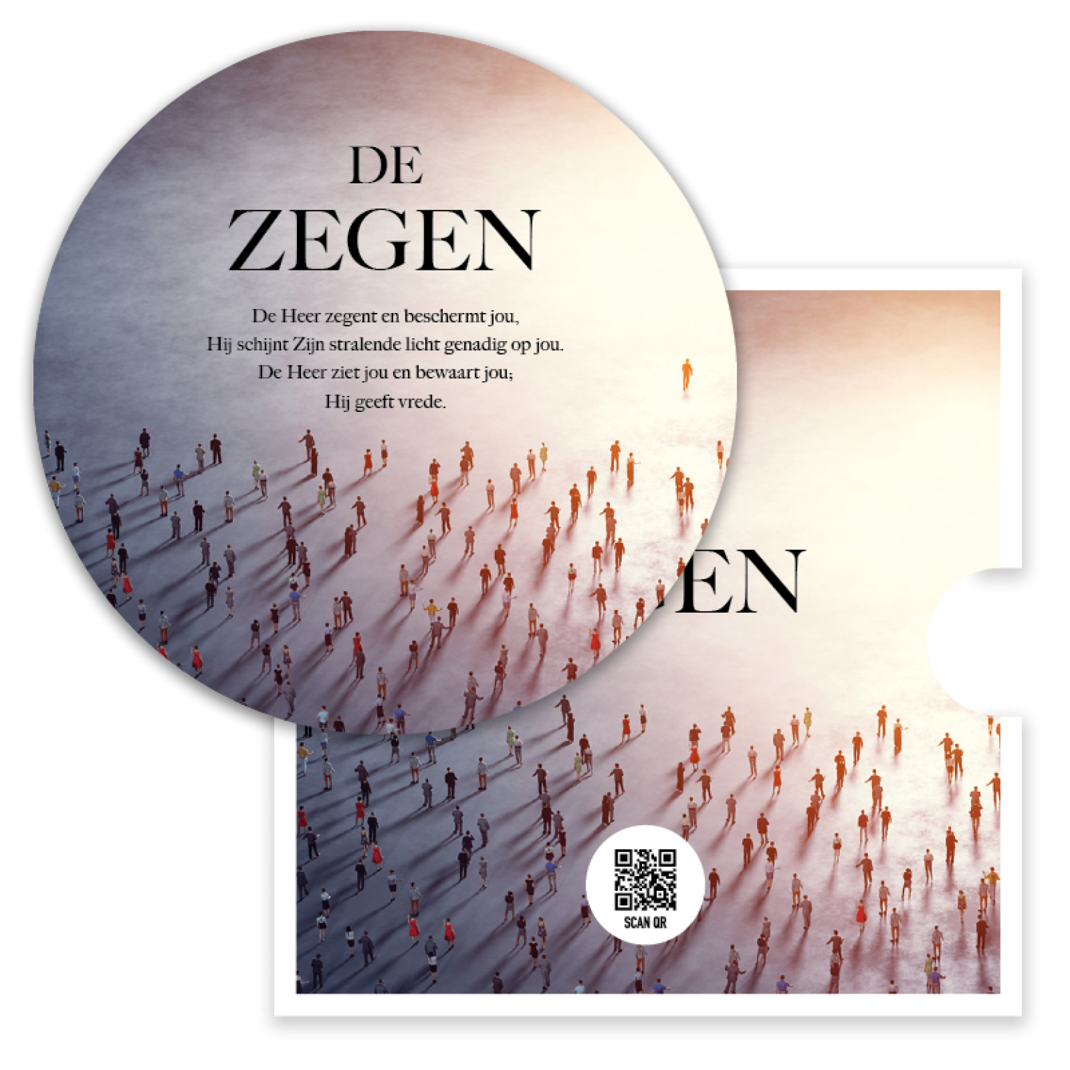 Prachtige ronde fotokaart met de tekst ‘De Zegen’. Een kaart vol bemoediging waarmee je de ander kunt zegenen. De kaart bevat een QR-code die direct leidt naar het muziekbestand van Opwekking 844 – een bijzonder lied dat woorden van vrede en genade uitspreekt.