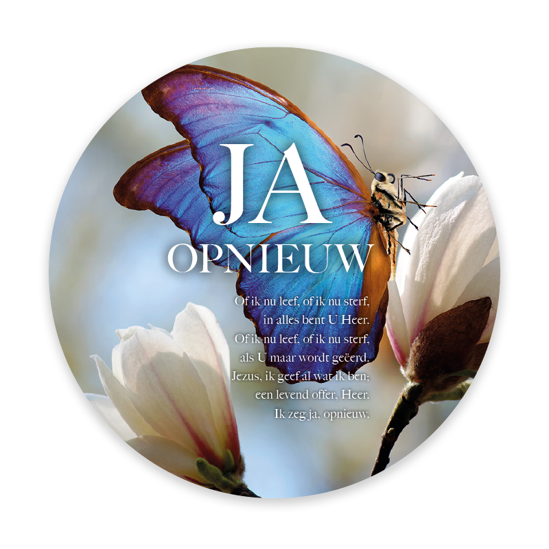 Prachtige ronde fotokaart met de tekst ‘Ja opnieuw’, een betekenisvolle kaart om te geven bij doop of belijdenis.