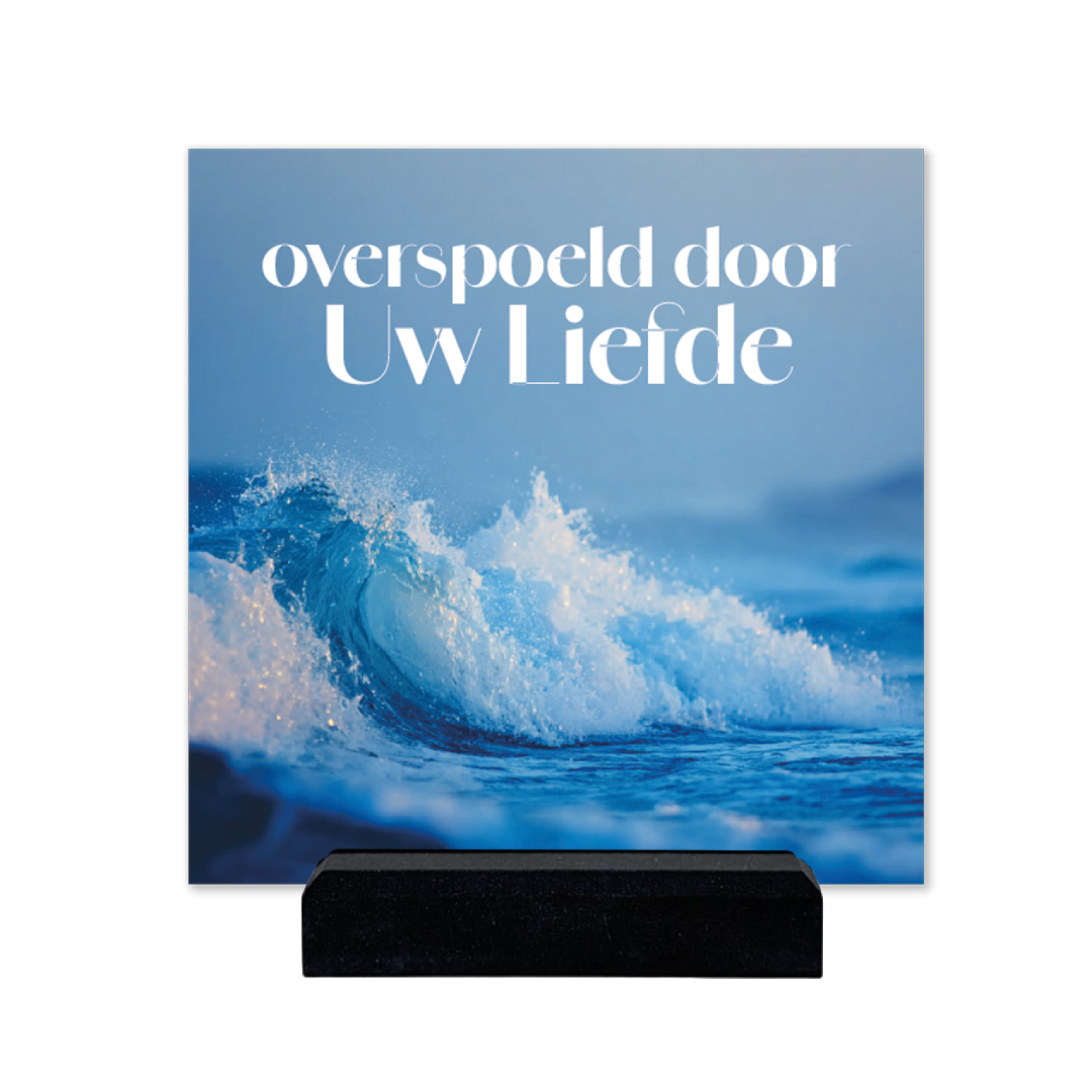 Stijlvol plexiglas bordje, voorzien van de tekst Overspoeld door Uw liefde. Het beeld straalt rust, geborgenheid en vertrouwen uit. Het lichtdoorlatende plexiglas laat de blauwe tinten zacht en helder tot leven komen. Geleverd met een houten standaard voor een warme, natuurlijke uitstraling. Een betekenisvol item voor je interieur of een bemoedigend christelijk cadeau.