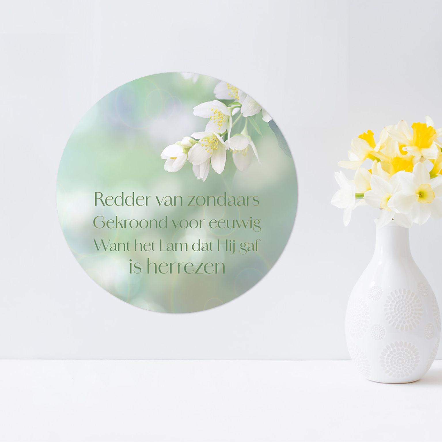 Dit ronde bord met de inspirerende tekst ‘Redder van zondaars, Gekroond voor eeuwig, want het Lam dat Hij gaf is herrezen’ is een prachtige christelijke decoratie voor de 40-dagentijd en Pasen. Op de achtergrond zie je een bloeiende tak, als symbool van nieuw leven en hoop. Perfect om op te hangen of neer te zetten en zo de betekenis van Pasen zichtbaar in huis te maken.