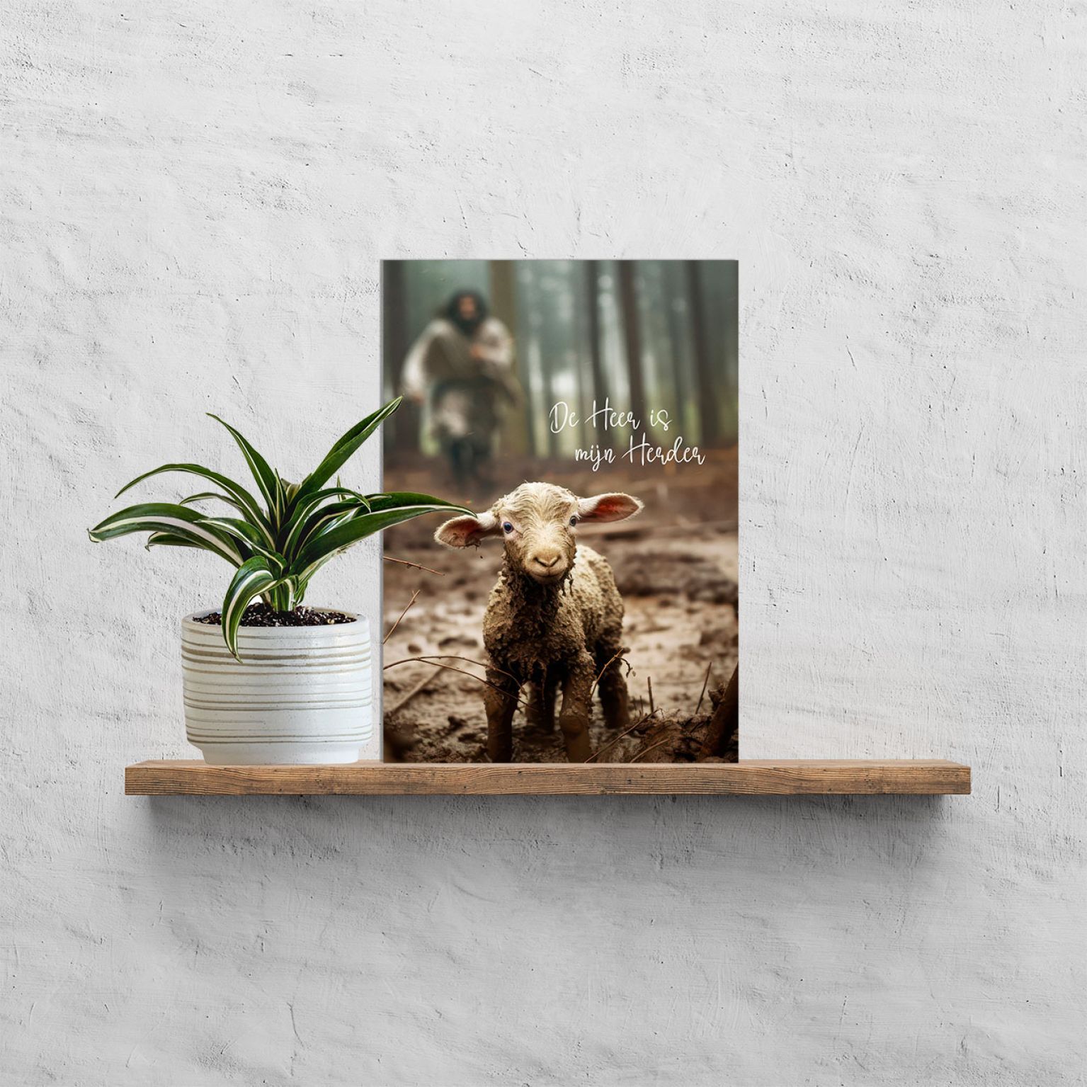 Plaat van plexiglas met de afbeelding van een lam met op de achtergrond een herder. Met de tekst: ‘De Heer is mijn Herder‘.