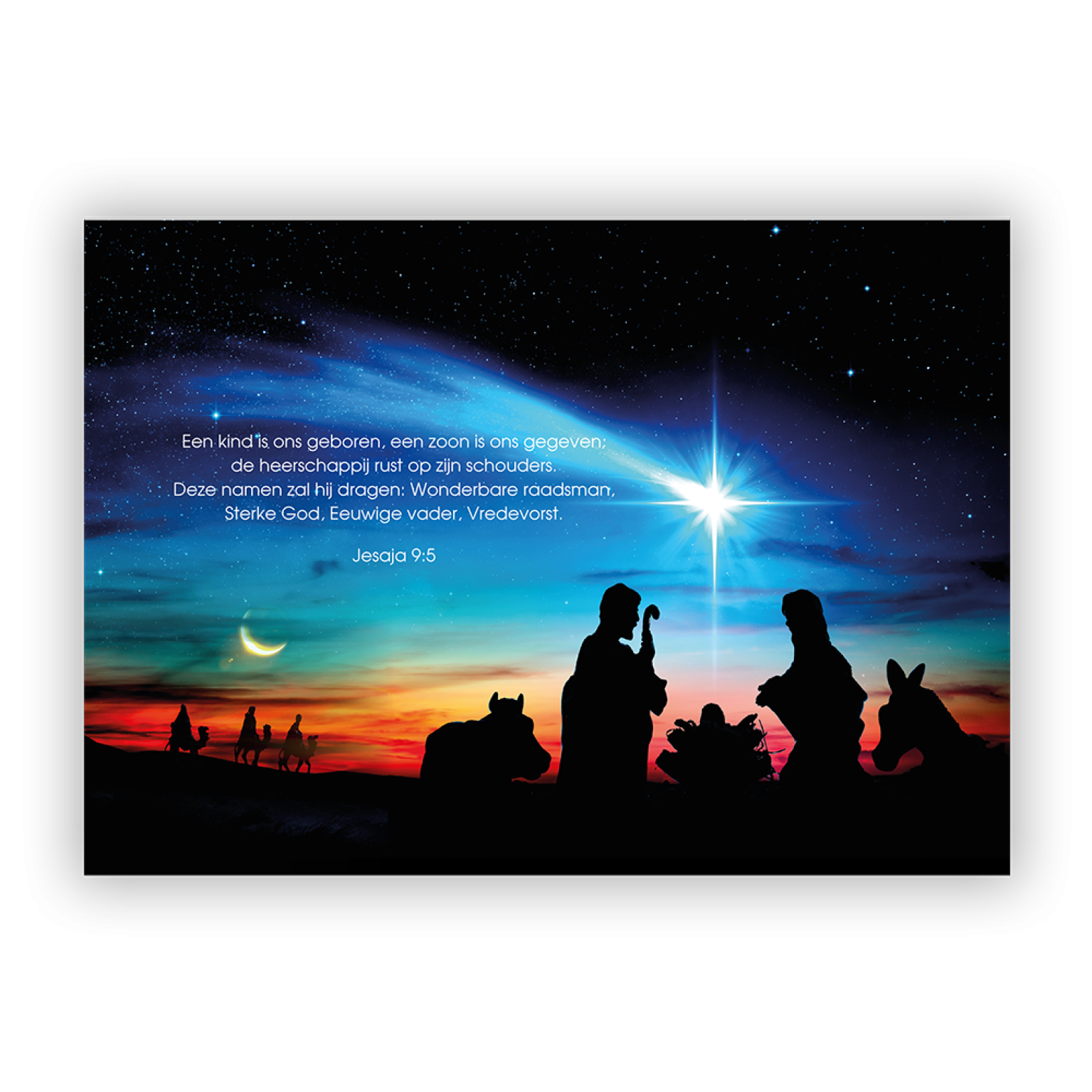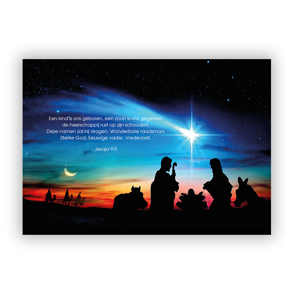 Duurzaam cadeaubord van plexiglas met afbeelding van een kerststal en de profetie over de Messias uit Jesaja 9:5-6.