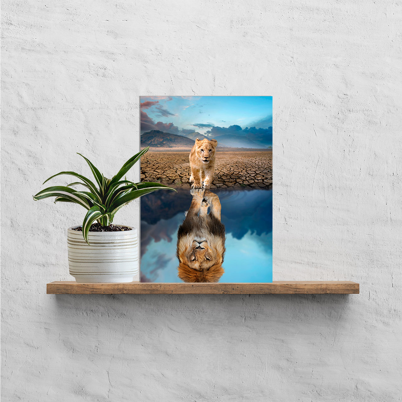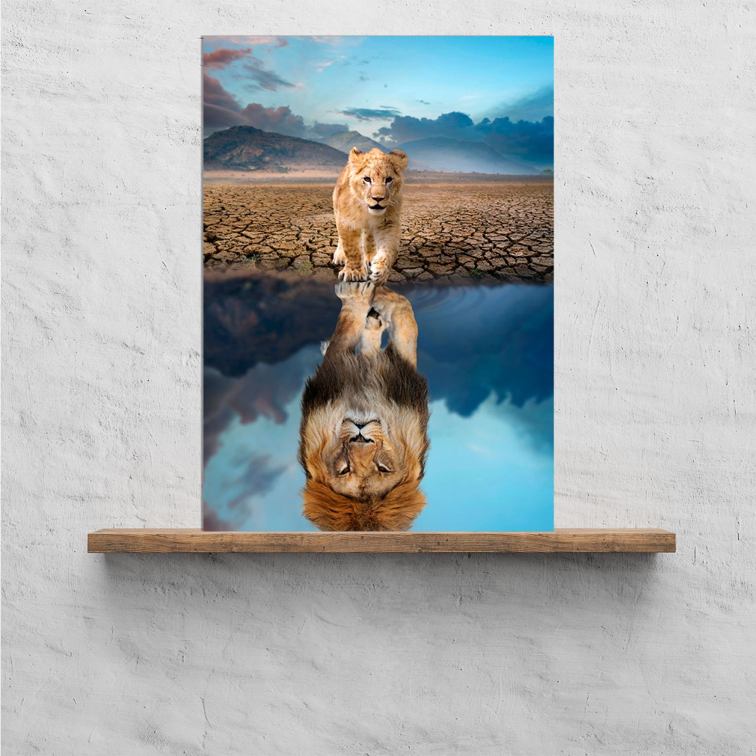 Plaat van plexiglas met de sprekende afbeelding van een welpje met in de weerspiegeling van het water een grote leeuw.