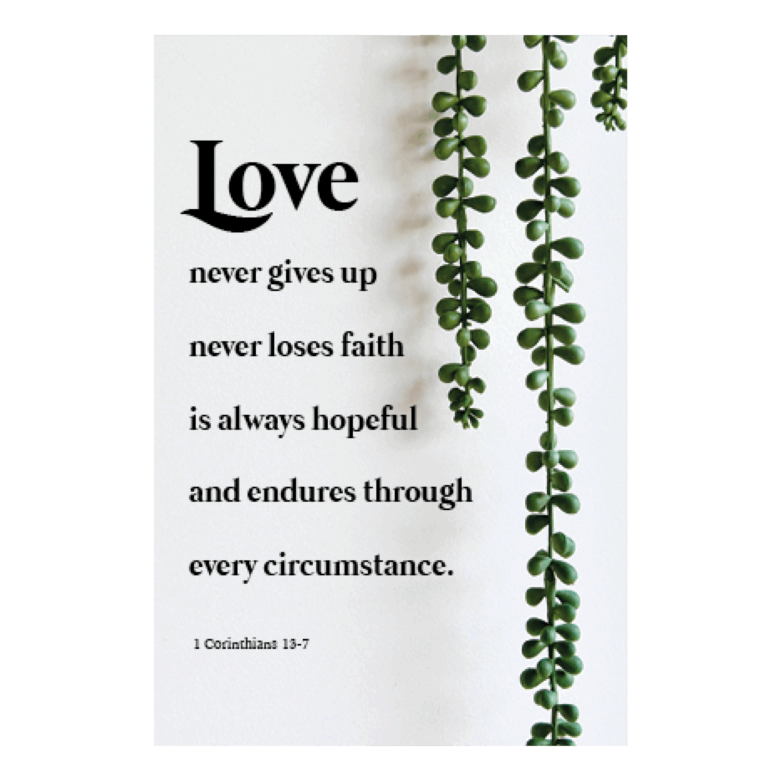 Grote poster met tekst uit 1 Korintiërs 13:7