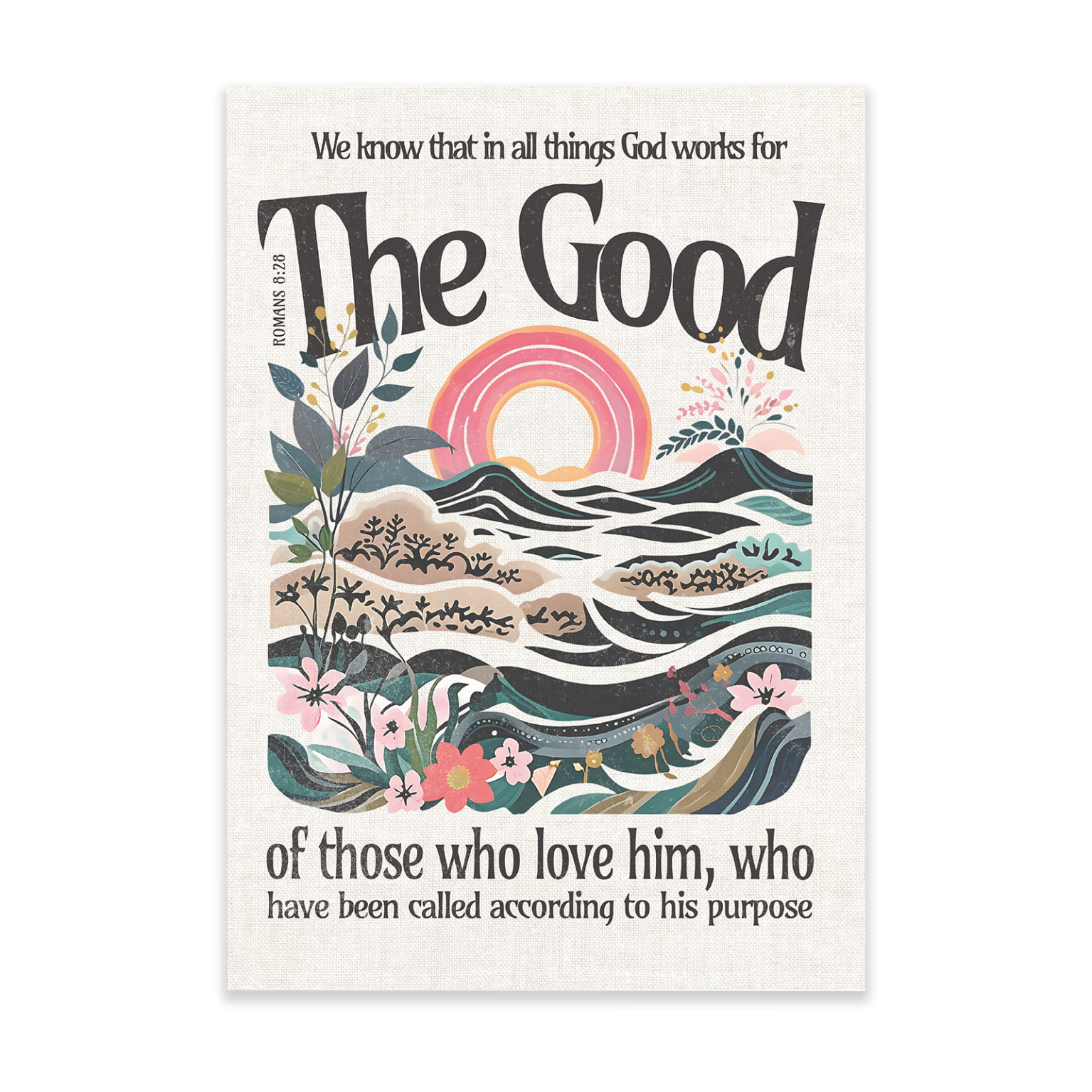 Deze christelijke poster met een zee, ondergaande zon en bloemen is voorzien van de Bijbeltekst Romeinen 8:28. Het rustige en natuurlijke ontwerp straalt hoop en vertrouwen uit en past goed in verschillende ruimtes. De poster is gedrukt op stevig papier, waardoor de kleuren mooi tot hun recht komen. Verkrijgbaar in A3 en 50×70 cm. De poster wordt zorgvuldig opgerold en geleverd in een stevige koker.
