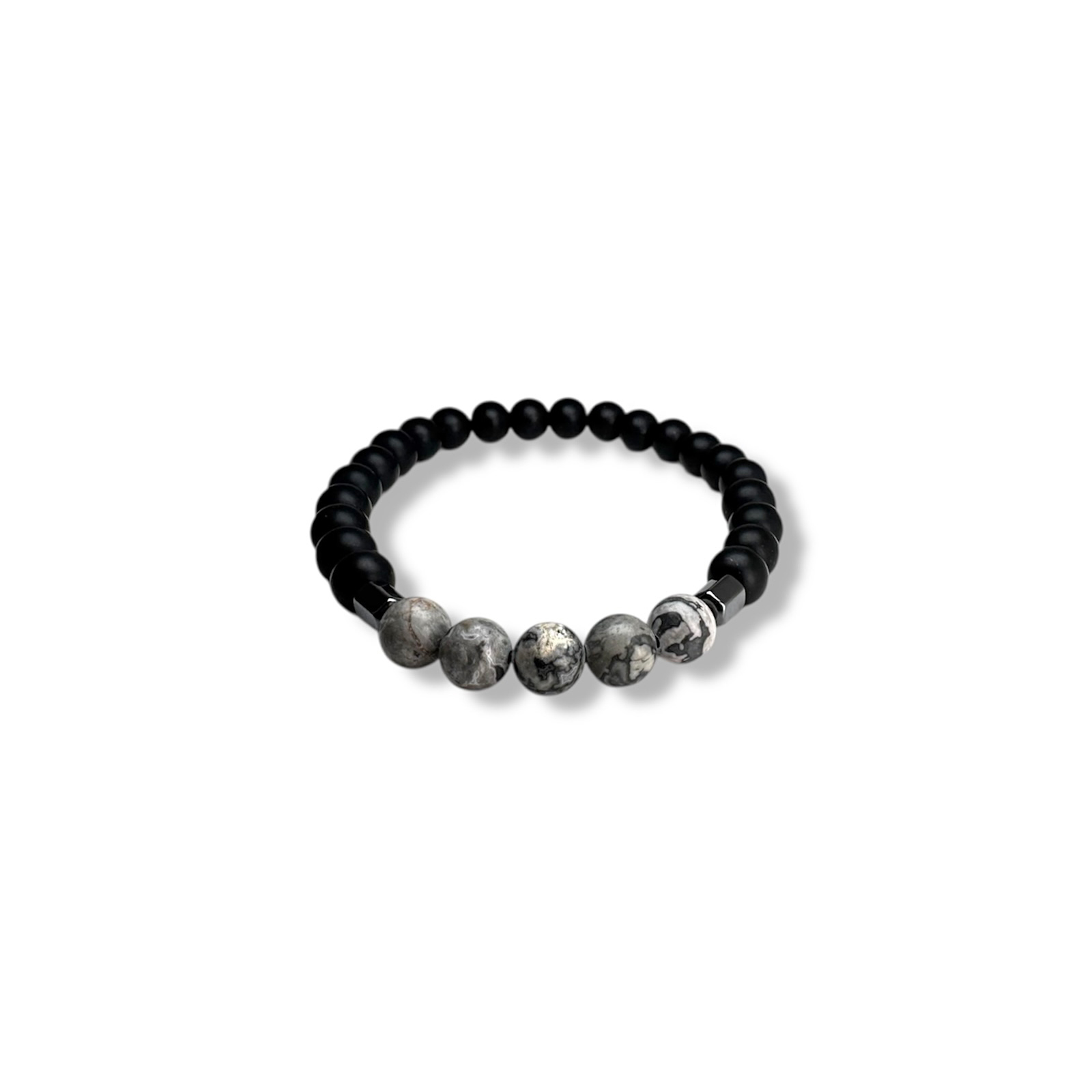 Een stoere, maar toch elegante armbandenset voor heren, gemaakt van kralen en met kruissymbool.