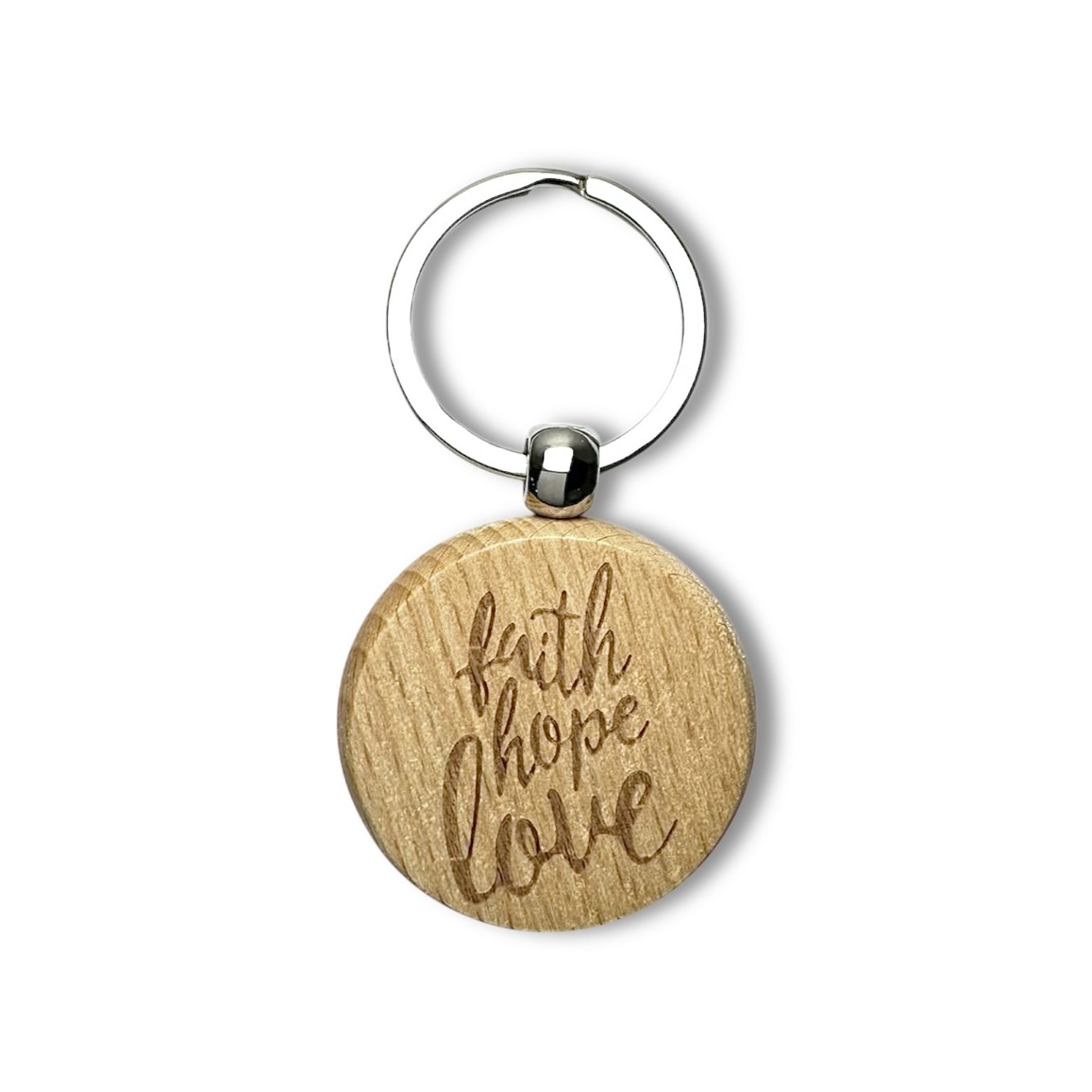 Leuke houten sleutelhanger met de tekst ‘Faith Hope Love’.