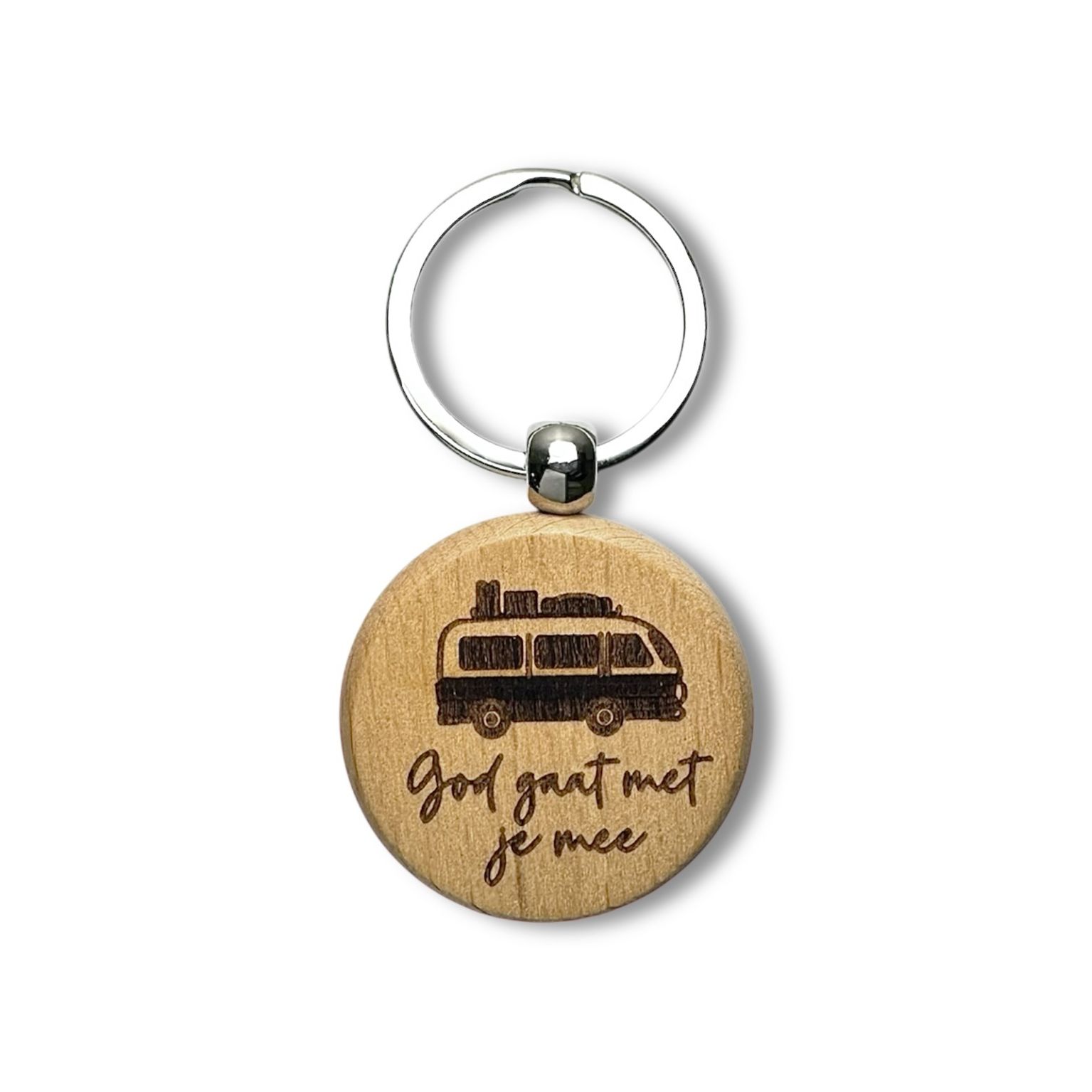 Leuke houten sleutelhanger met de tekst ‘God gaat met je mee’.