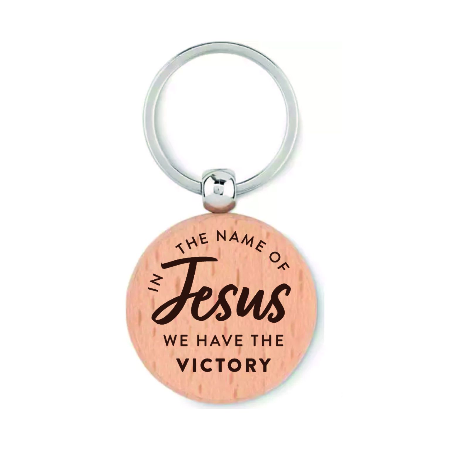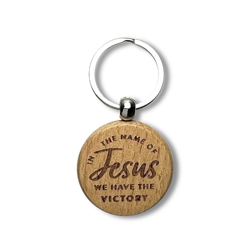 Leuke houten sleutelhanger met de tekst ‘In the name of Jesus we have the victory’.
