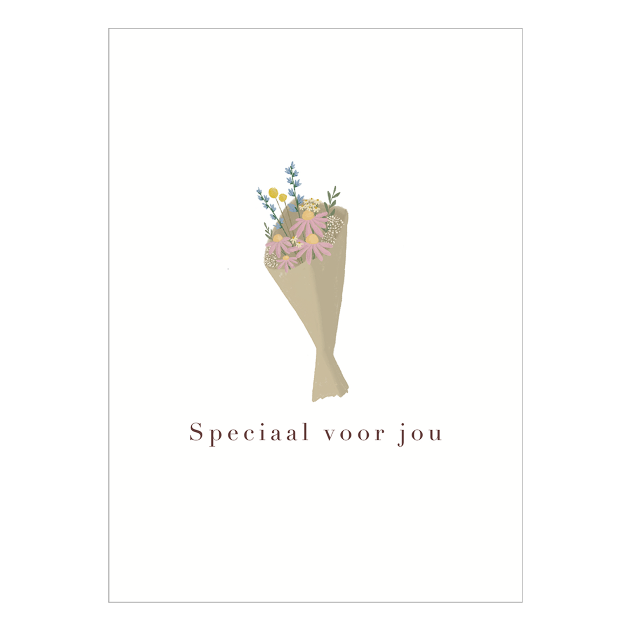 Een enkele kaart op dik papier met de afbeelding van een bos bloemen met de tekst ‘Speciaal voor jou’. Artikelnummer: MA58033