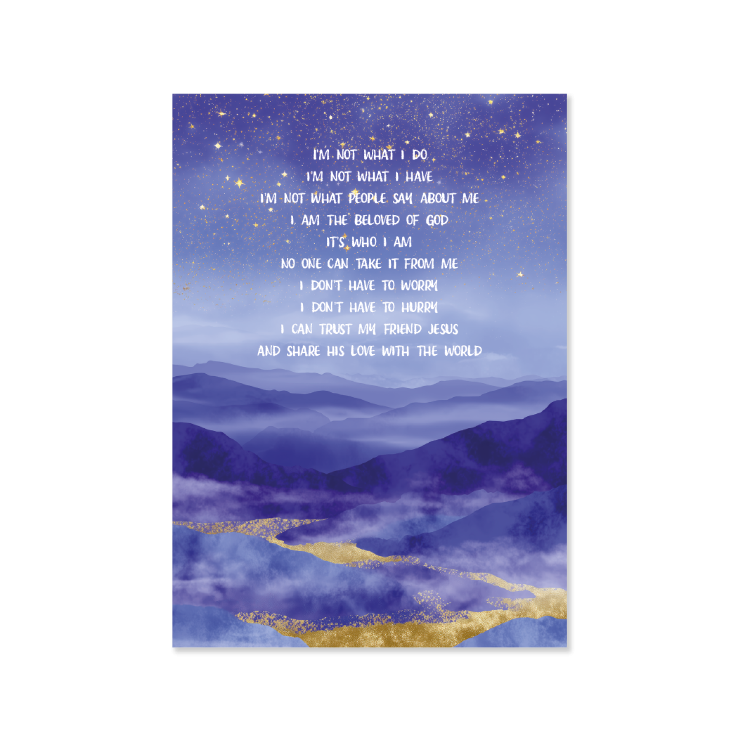 Indrukwekkend plexiglas wandbord met het credo van Hour of Power in het Engels. De paarse afbeelding toont een berglandschap onder een sterrenhemel met een subtiel goudspoor dat hoop en richting symboliseert. Dankzij het plexiglas komen de diepe kleuren en goudtinten extra levendig naar voren.
