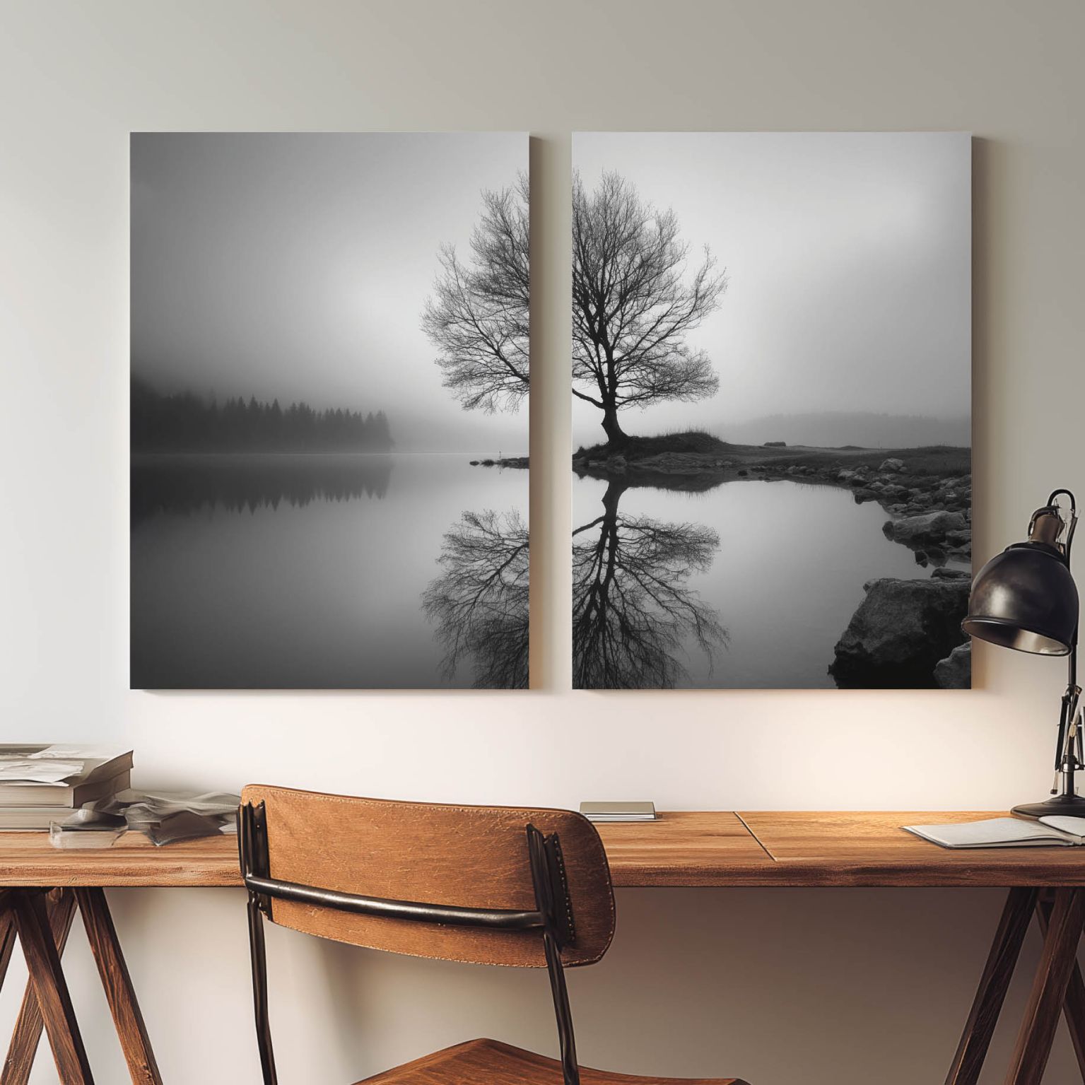 Prachtig tweeluik met een serene zwart-witafbeelding van een boom bij het water.