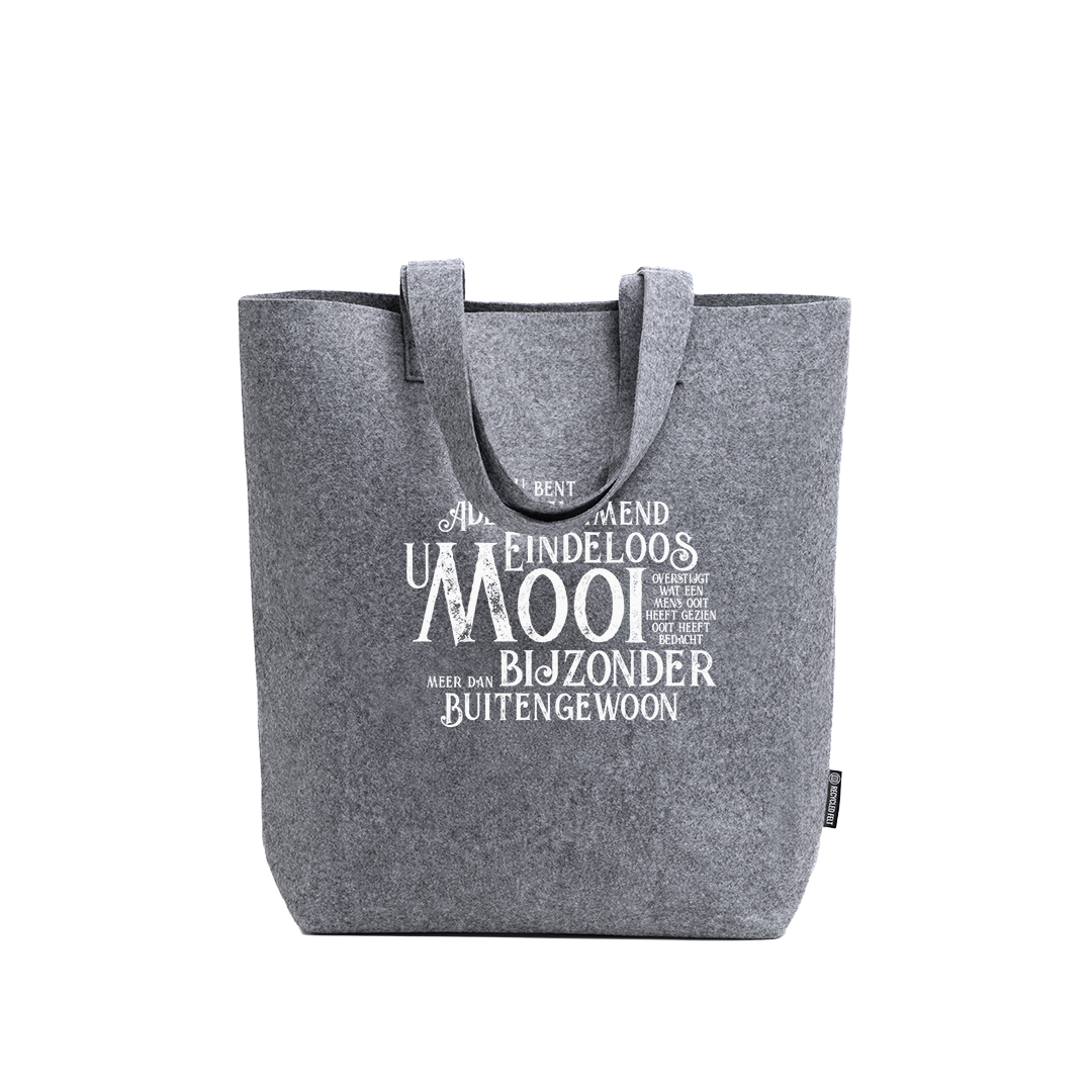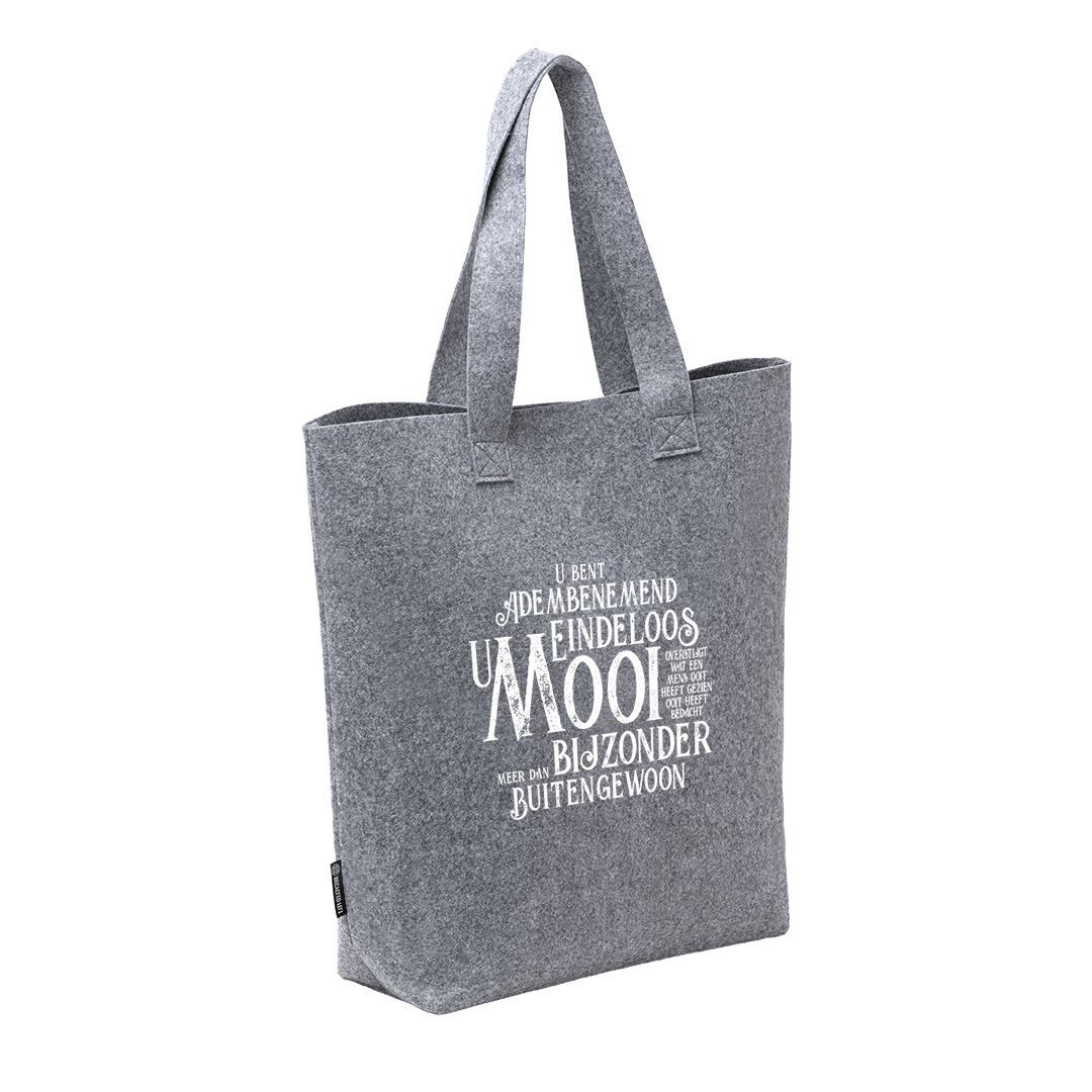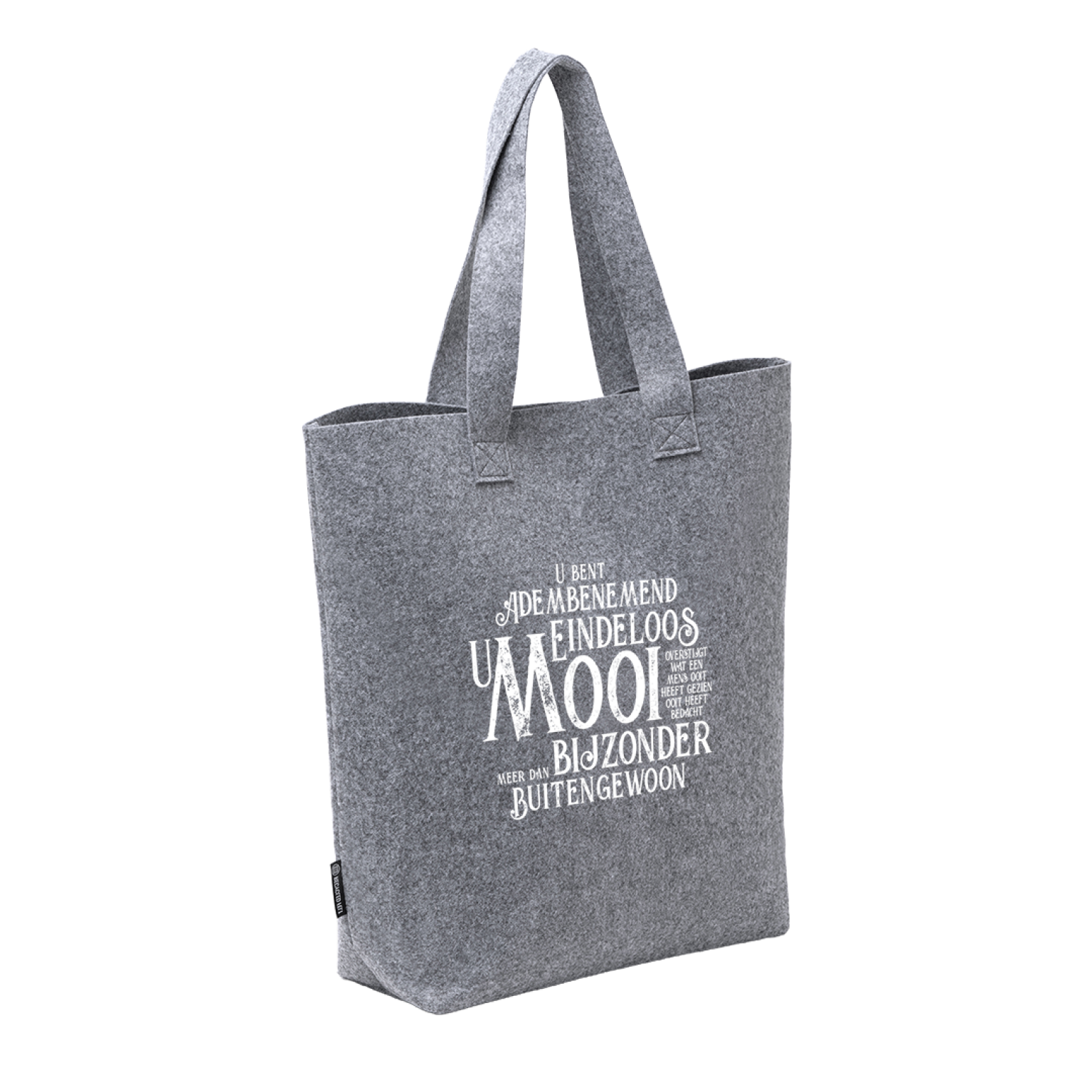 Deze vilten schoudertas met de tekst ‘Adembenemend’ is geïnspireerd op Opwekkingslied 684. De tas is gemaakt van gerecycled vilt en heeft een strakke witte opdruk. De versterkte handgrepen van 70 cm zorgen voor comfort en duurzaamheid. Deze tas is ideaal voor dagelijks gebruik.