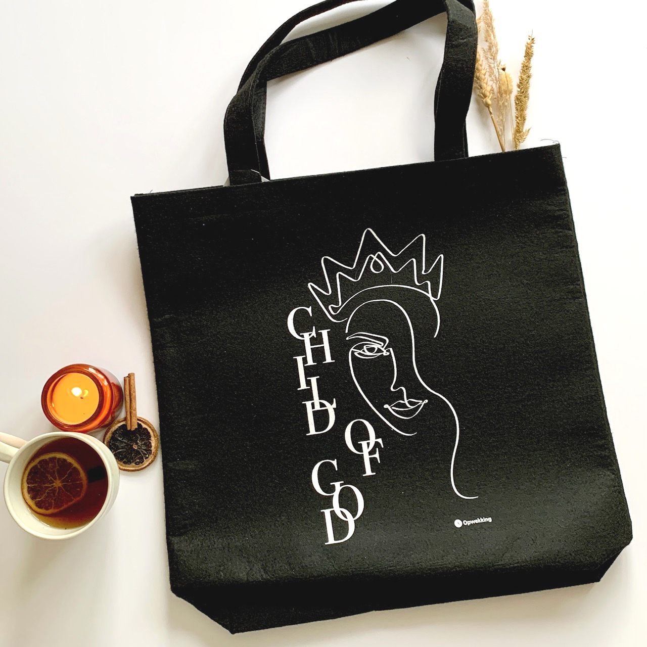 Deze zwarte vilten tas met de opdruk ‘Child of God’ heeft een formaat van ongeveer 41 × 43 cm. Perfect om mee te nemen tijdens een dagje uit of voor dagelijks gebruik!
