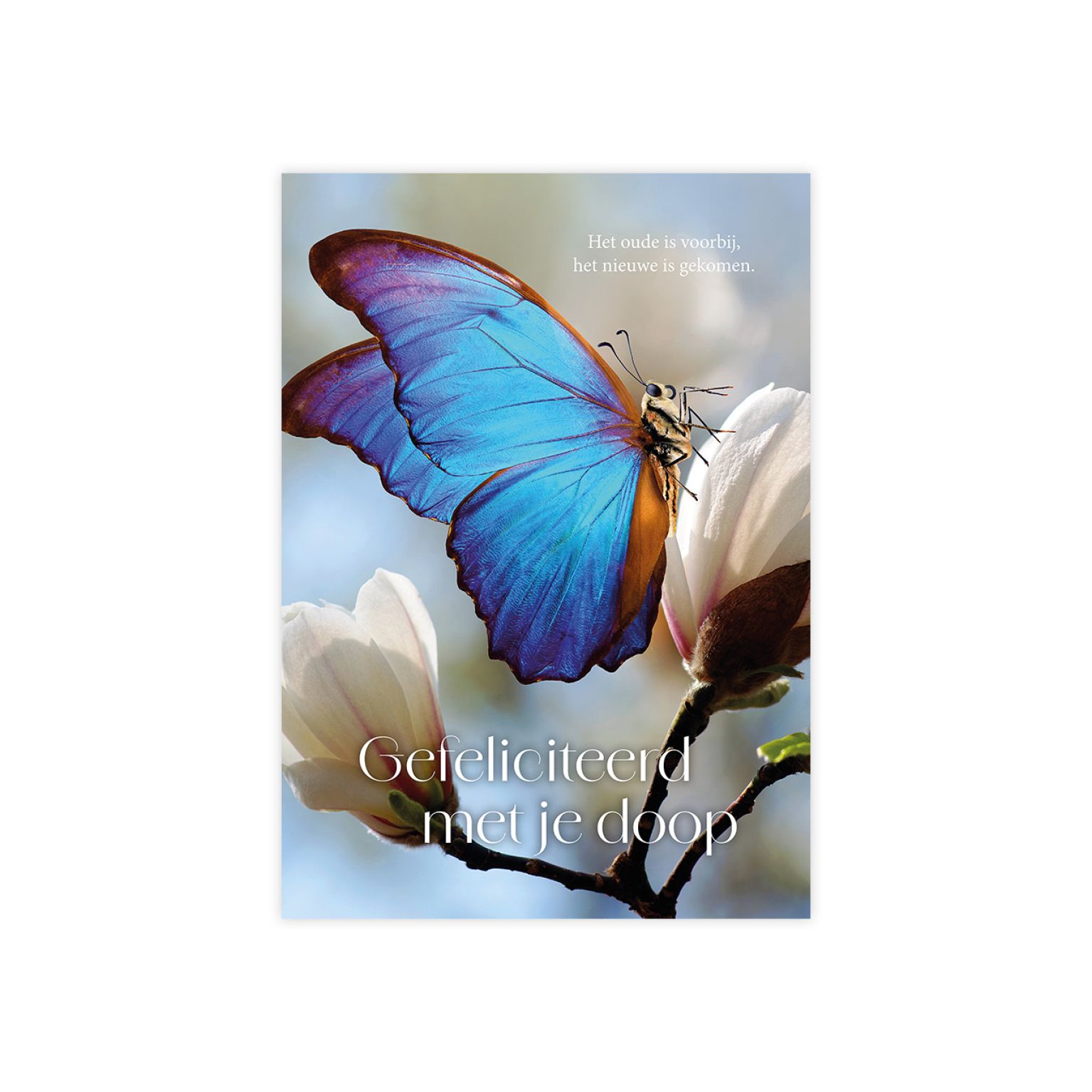 Deze christelijke voordeelkaart verwijst naar de krachtige boodschap uit 2 Korinthe 5:17 over vernieuwing en nieuw leven. De vlinder op de kaart onderstreept dit beeld van verandering en hoop. Een mooie kaart om iemand te feliciteren met de doop.