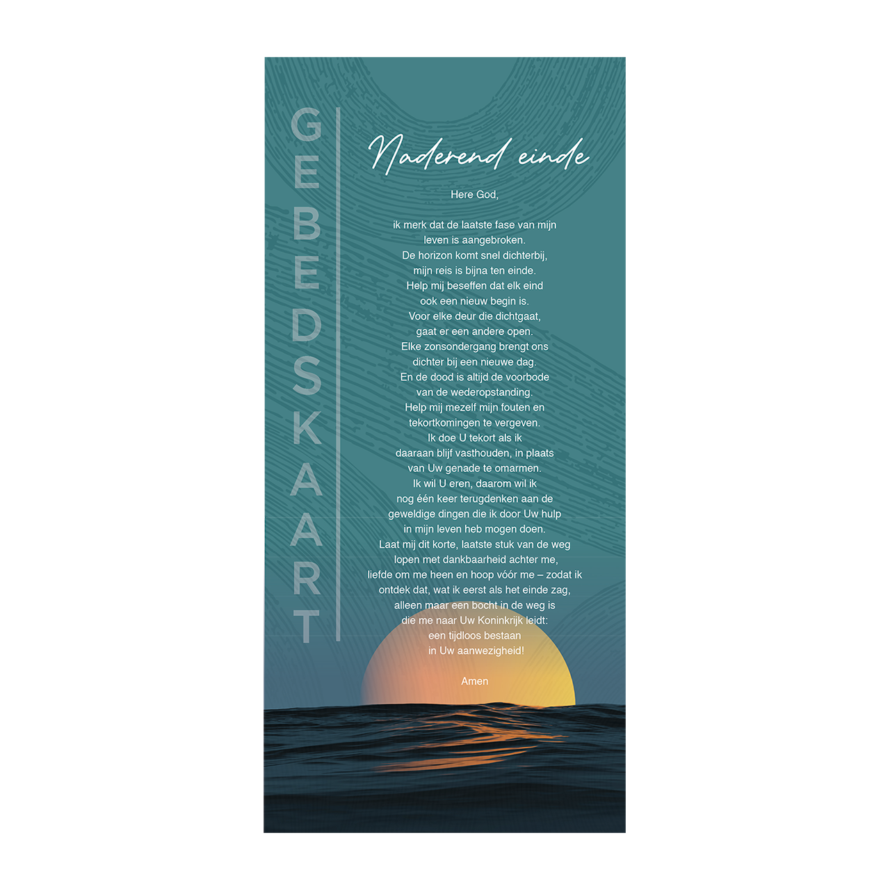 Set van 12 verschillende gebedskaarten met onder andere de volgende titels: Bij het overlijden, Volharding, Een gebed van hoop, De Heer is mijn Herder, St. Patrick en Naderend einde.