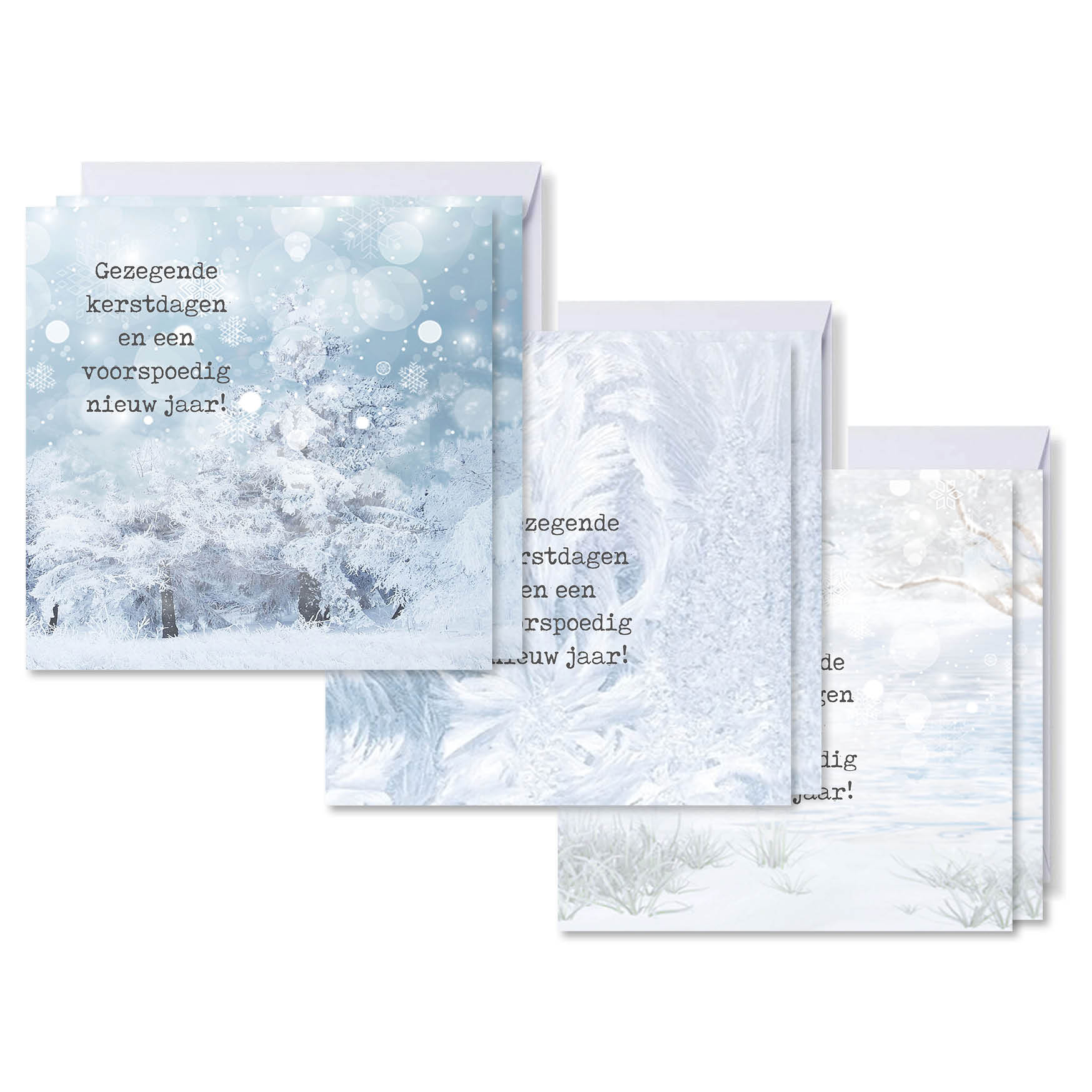 Vier de feestdagen in stijl met deze retro kerstkaarten! Dit voordeelpak bevat 6 enkelzijdige kaarten, inclusief enveloppen, met sfeervolle ontwerpen van ijskristallen en sneeuw. Iedere set bevat 2 kaarten van elk ontwerp. De blanco achterzijde biedt volop ruimte voor jouw persoonlijke boodschap. Perfect voor een warme kerstgroet!