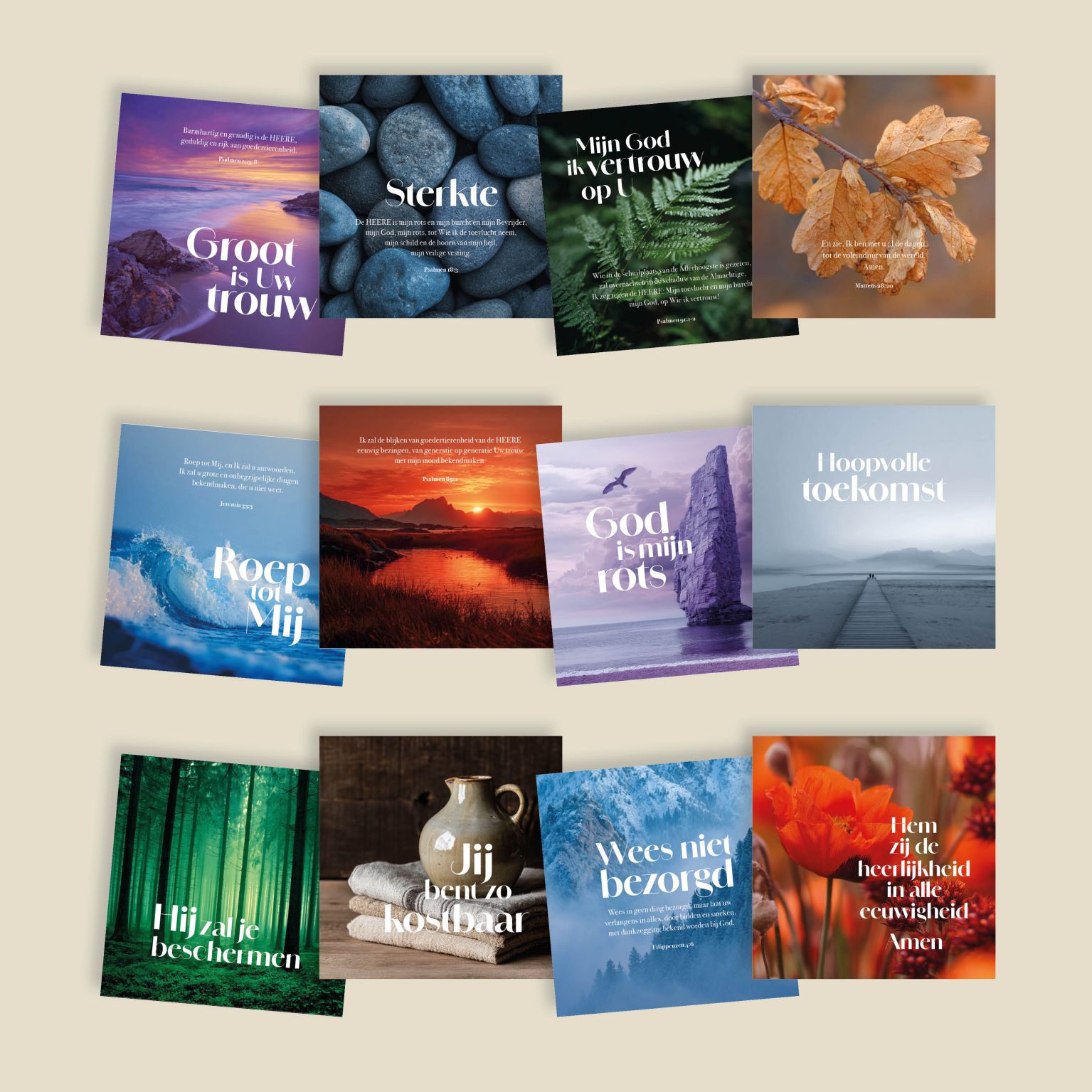 Dit voordeelpakje bevat 12 enkele kaarten uit de serie 4 Seasons, allemaal met envelop. De kaarten hebben een kleurrijk design met afbeeldingen uit de natuur en de seizoenen. De kaarten bevatten christelijke teksten of Bijbelteksten uit de HSV, enkele zijn blanco. Voor elke gelegenheid is er een passende kaart beschikbaar.
