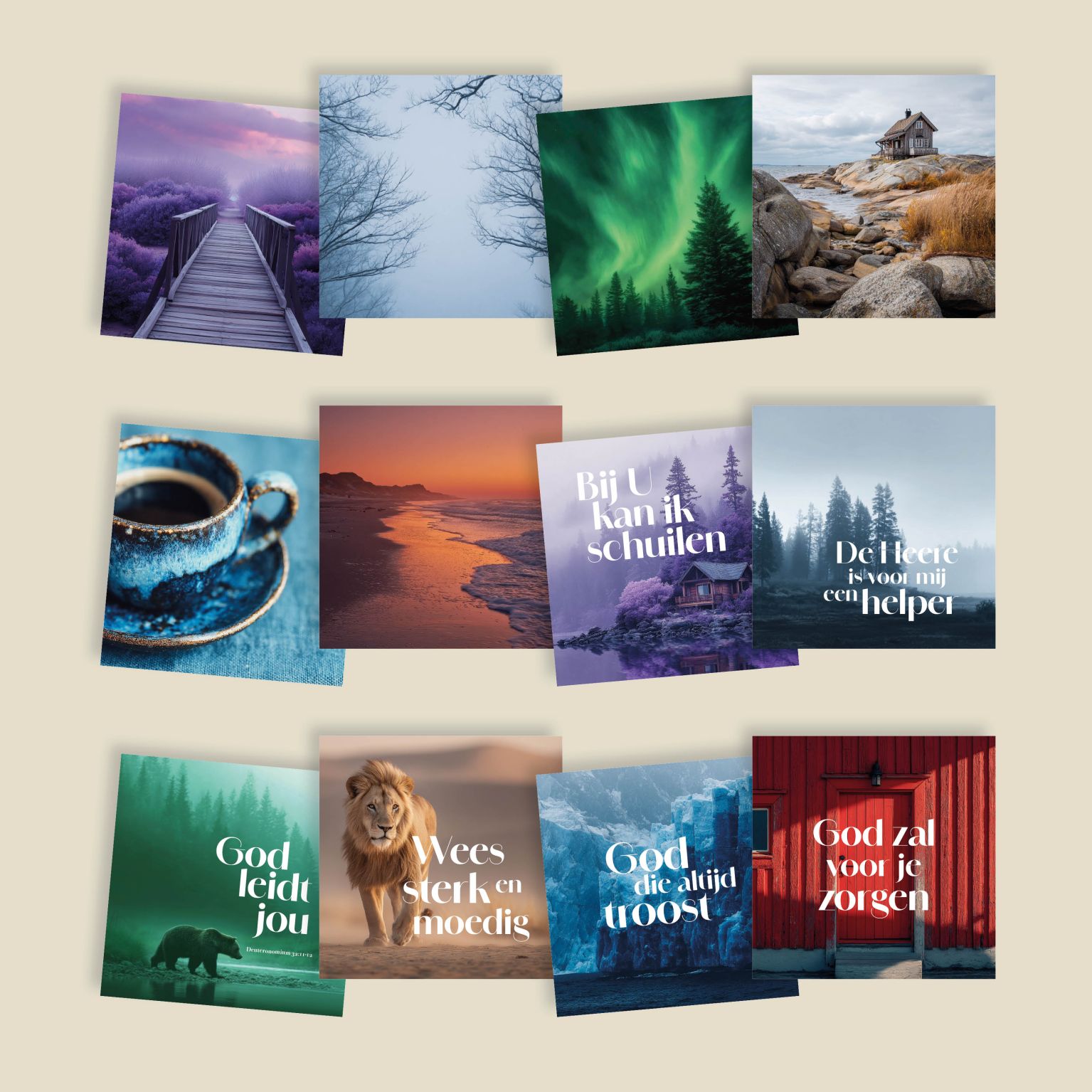 Dit voordeelpakje bevat 12 enkele kaarten uit de serie 4 Seasons, allemaal met envelop. De kaarten hebben een kleurrijk design met afbeeldingen uit de natuur en de seizoenen. De kaarten bevatten christelijke teksten of Bijbelteksten uit de HSV, enkele zijn blanco. Voor elke gelegenheid is er een passende kaart beschikbaar.