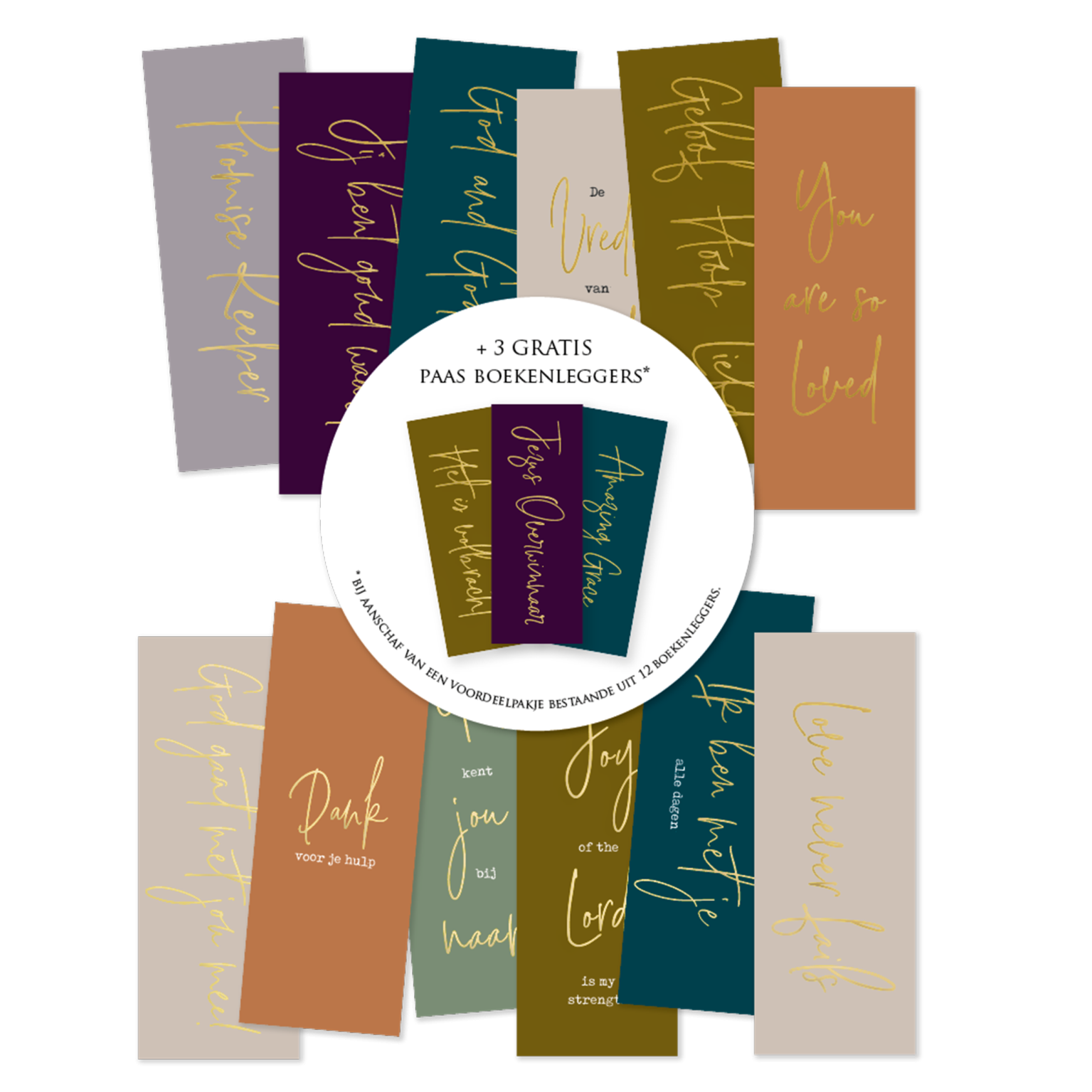 Dit voordeelpakje Schrijven is goud bevat 12 verschillende luxe boekenleggers met gouden letters en een stijlvolle uitstraling. De boekenleggers zijn van dikke kwaliteit en geschikt voor Bijbels, boeken en dagboeken.