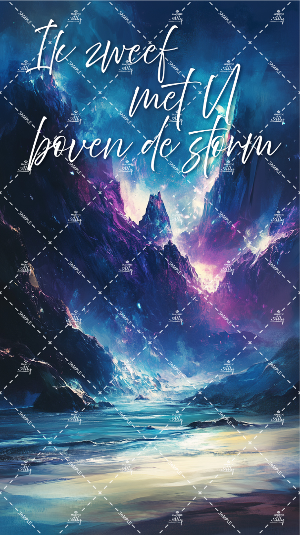 Download deze prachtige wallpaper voor je telefoon met de tekst ‘Ik zweef met U boven de storm’! Het design met bergen en water in paars- en blauwtinten brengt rust en moed, geïnspireerd door geloof. Perfect om je dagelijks te herinneren aan Gods nabijheid, zelfs boven de stormen van het leven.