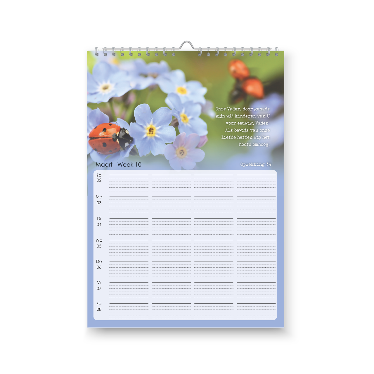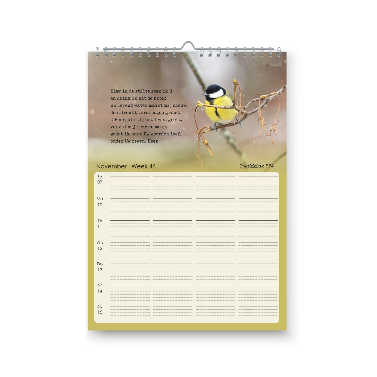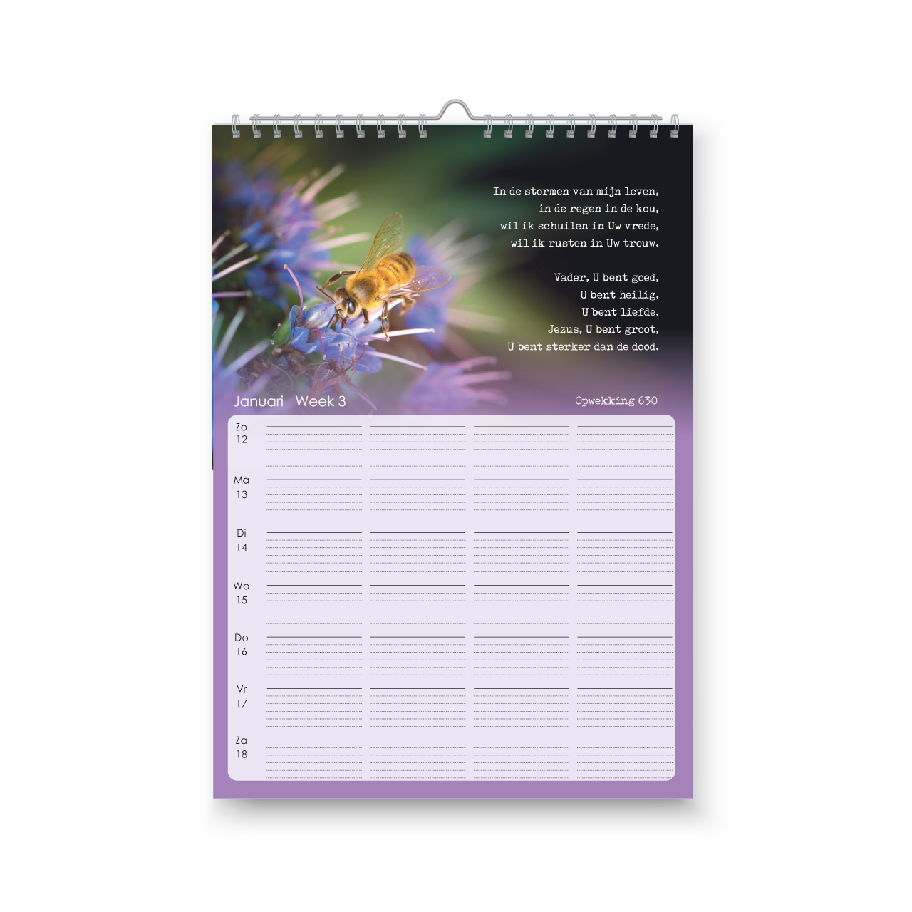 Christelijke weekplanner voor 2025 met teksten van Opwekkingsliederen, met prachtige natuurafbeeldingen.