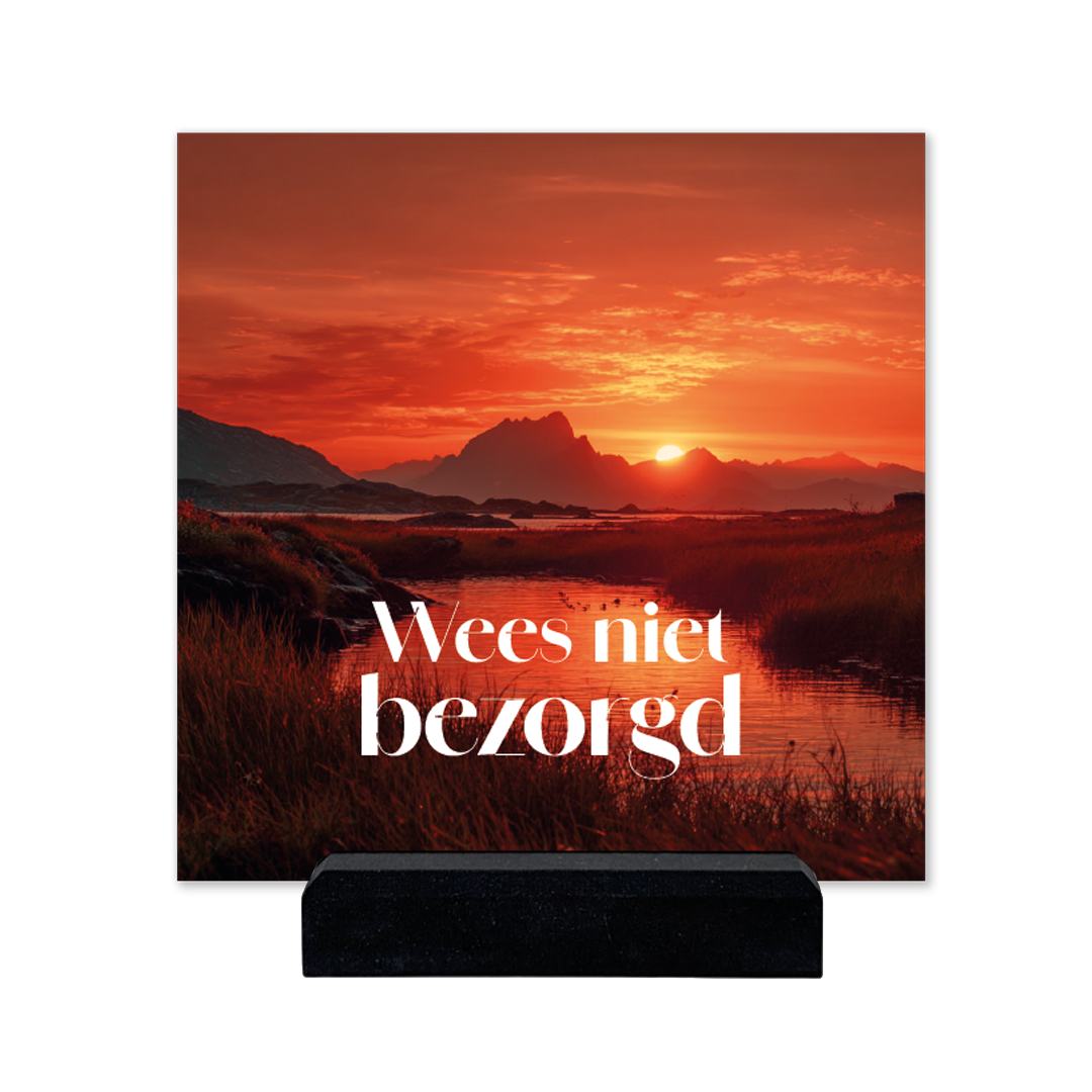Stijlvol plexiglas bordje met de tekst Wees niet bezorgd. Dankzij het lichtdoorlatende plexiglas komen de kleuren zacht en helder tot leven. Wordt geleverd met een houten standaard voor een warme, natuurlijke uitstraling. Een betekenisvolle toevoeging aan je interieur of een bemoedigend christelijk cadeau, passend bij momenten van stille tijd.