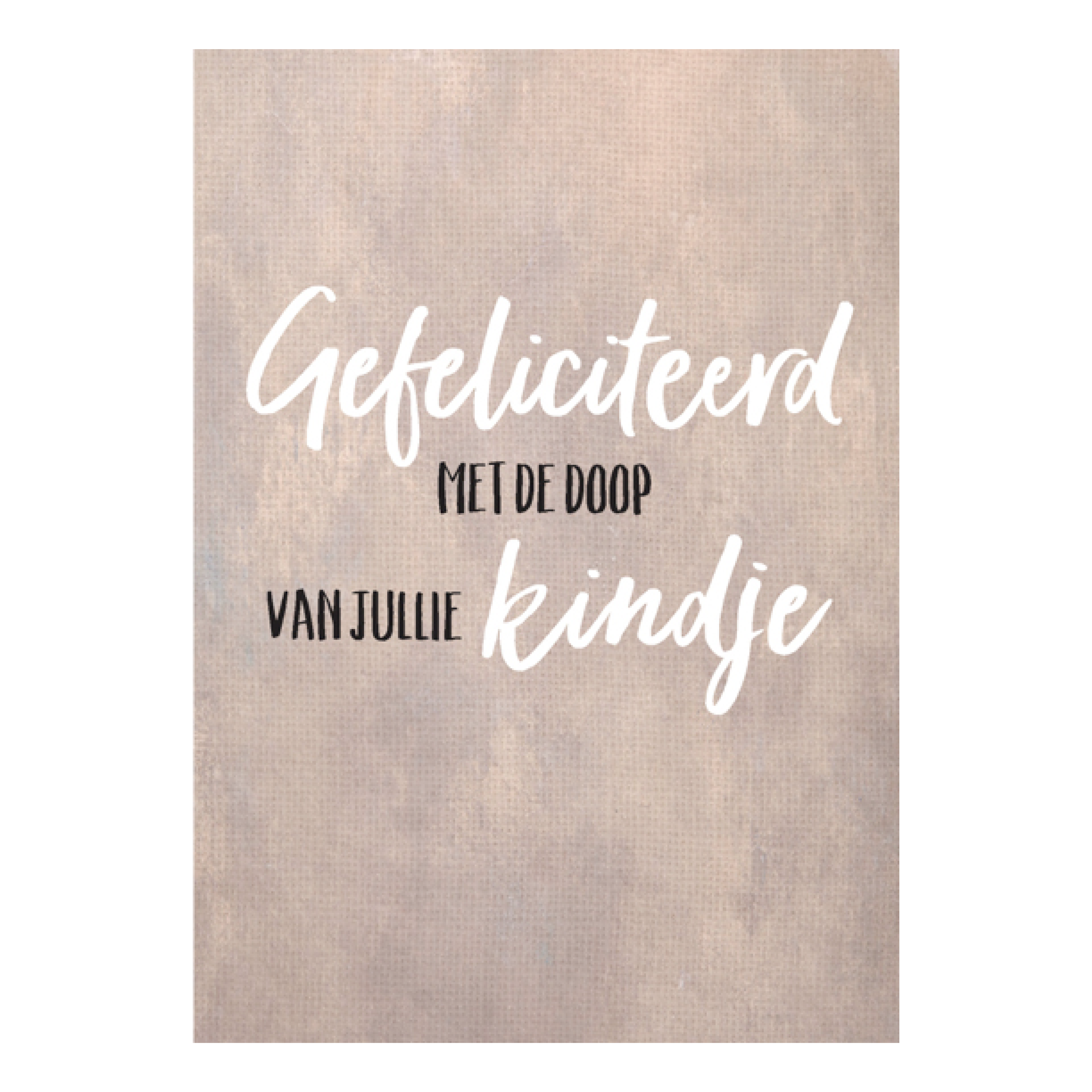Dubbele kaart van ca 11×16 cm met de tekst: ‘Gefeliciteerd met de doop van jullie kindje’